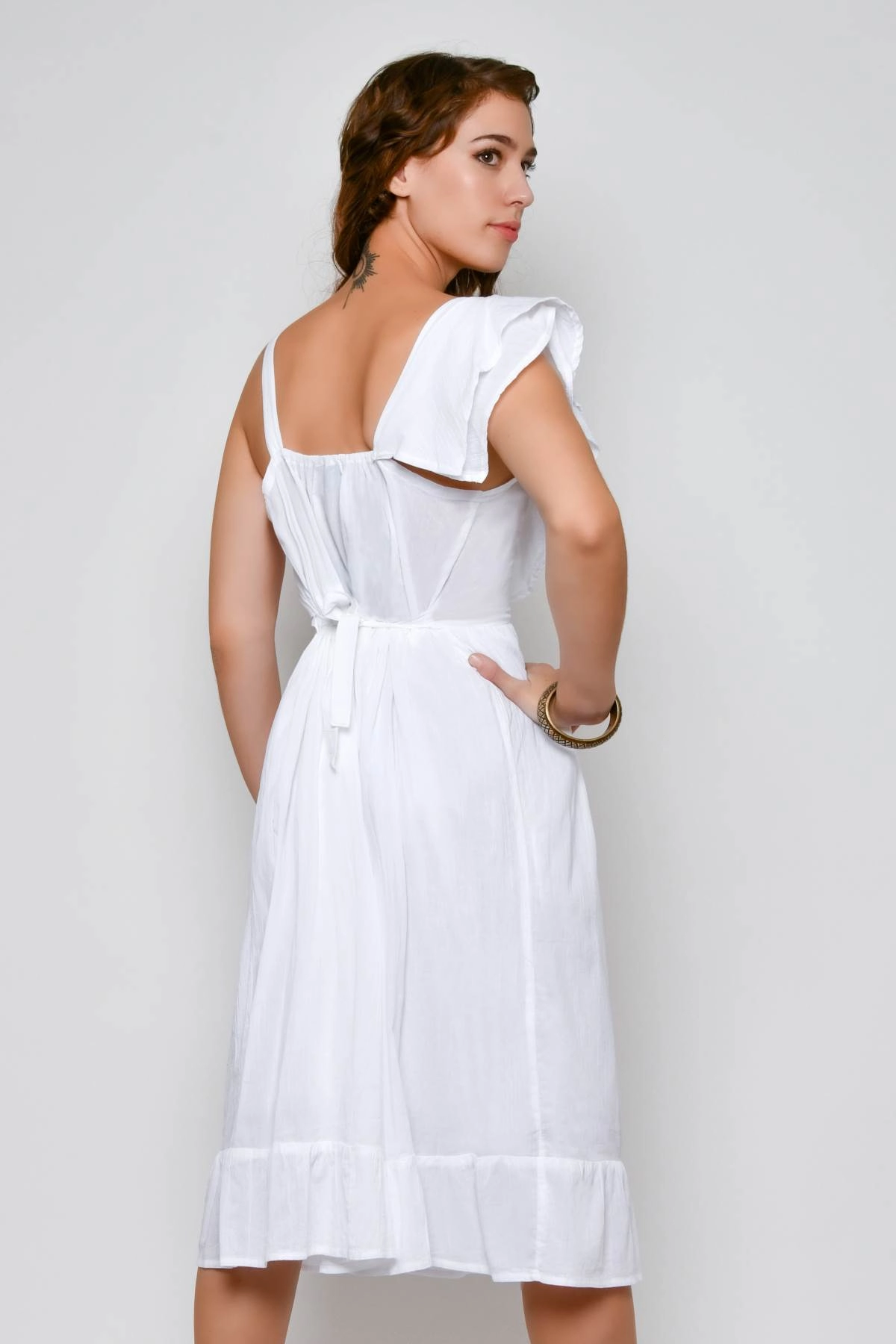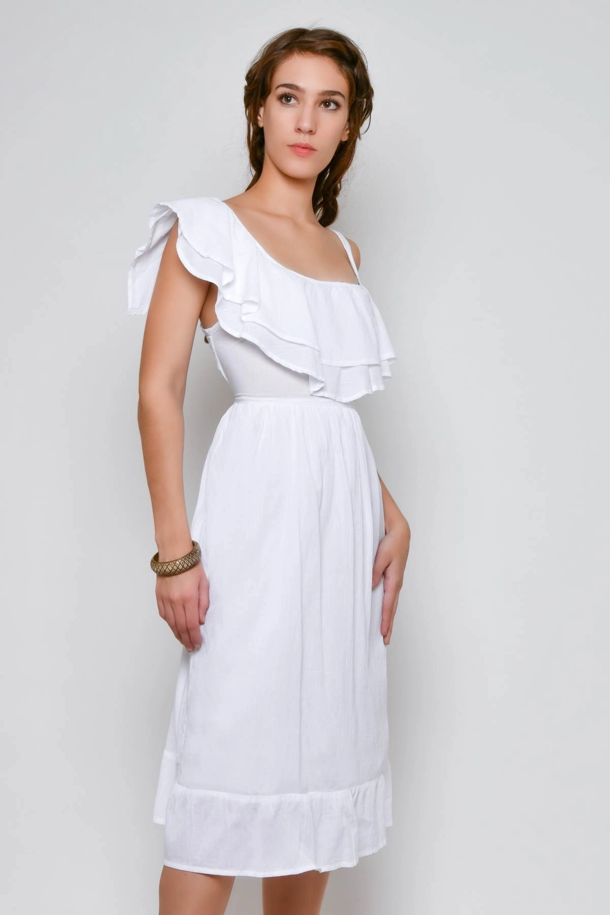 Abito estivo bianco dallo stile chic e femminile, caratterizzato da un design originale con una spalla scoperta e doppio volant sull’altro lato. Il taglio in vita è elasticizzato, mentre il fondo con volant dona movimento all’abito. Il retro presenta una cintura regolabile che permette di adattare meglio la vestibilità. Realizzato in cotone indiano, è fresco e ideale per le giornate estive, eventi informali o cene all’aperto.