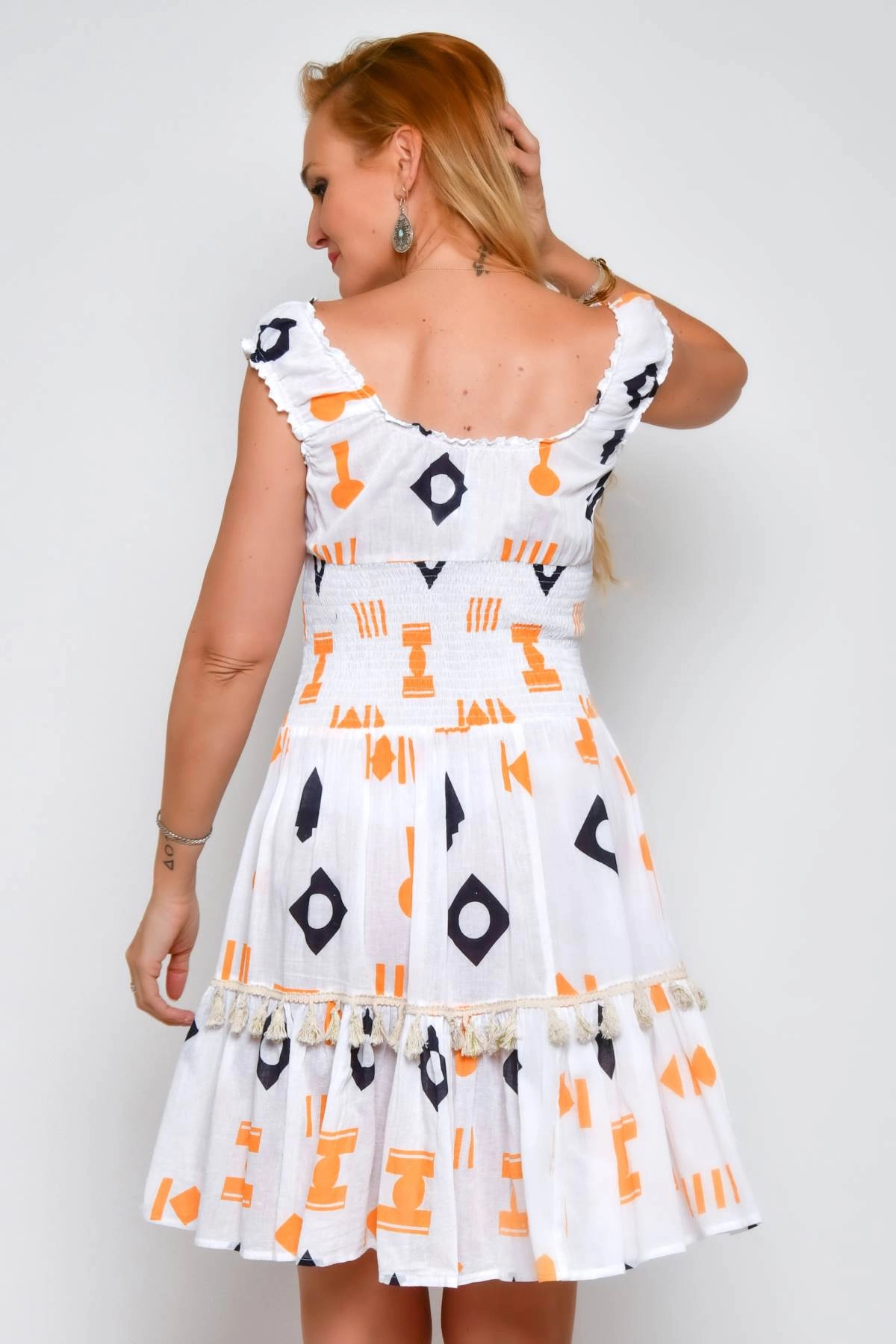 Abito estivo stile etnico boho, realizzato in cotone leggero. Il modello è senza maniche, con scollo a V effetto cuore con ricamo a rilievo impreziosito da perline (Beaded Embroidery) e vita elasticizzata. La fantasia geometrica nei toni bianco, arancione e nero richiama uno stile fresco e solare. La gonna è leggermente svasata con piccolo motivo decorativo sul fondo, un dettaglio boho chic che rende l'abito particolare. Vestito pratico e confortevole, adatto al giorno, alle vacanze o al tempo libero.