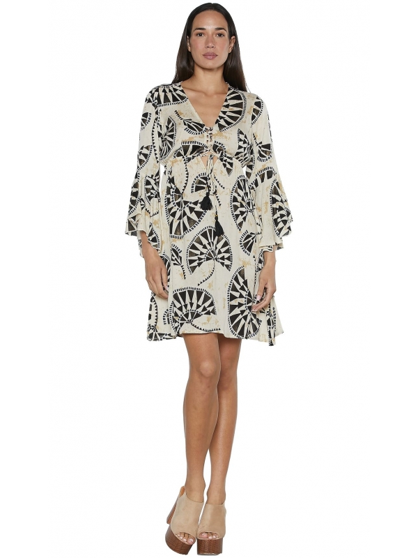 Abito estivo corto Baba Design in tessuto fresco e leggero, adatto alle giornate calde. Linea semplice con apertura frontale regolabile tramite lacci con nappine, che permette di indossarlo più chiuso oppure leggermente aperto.