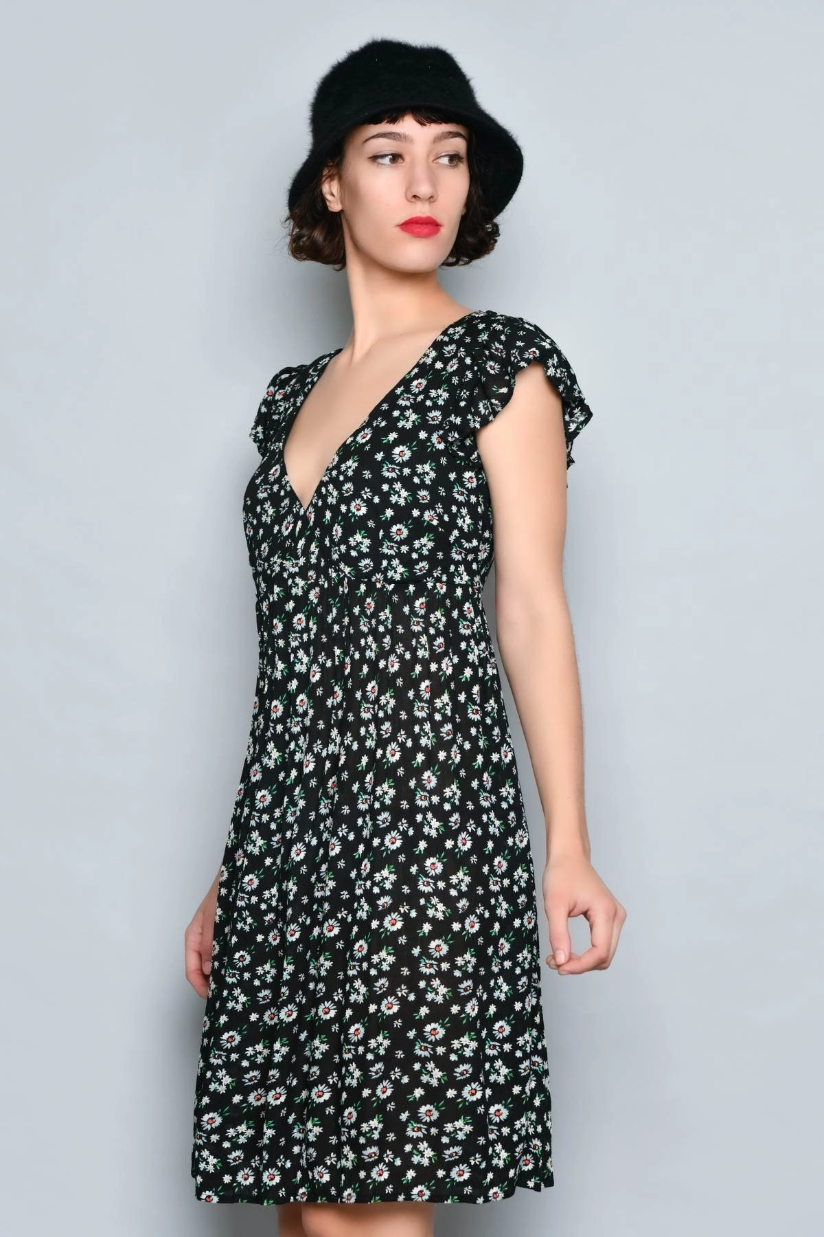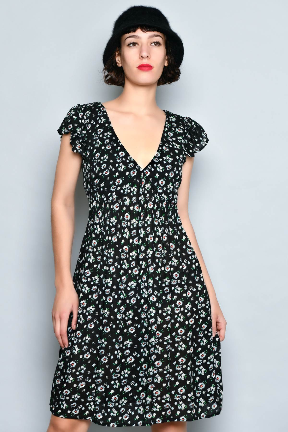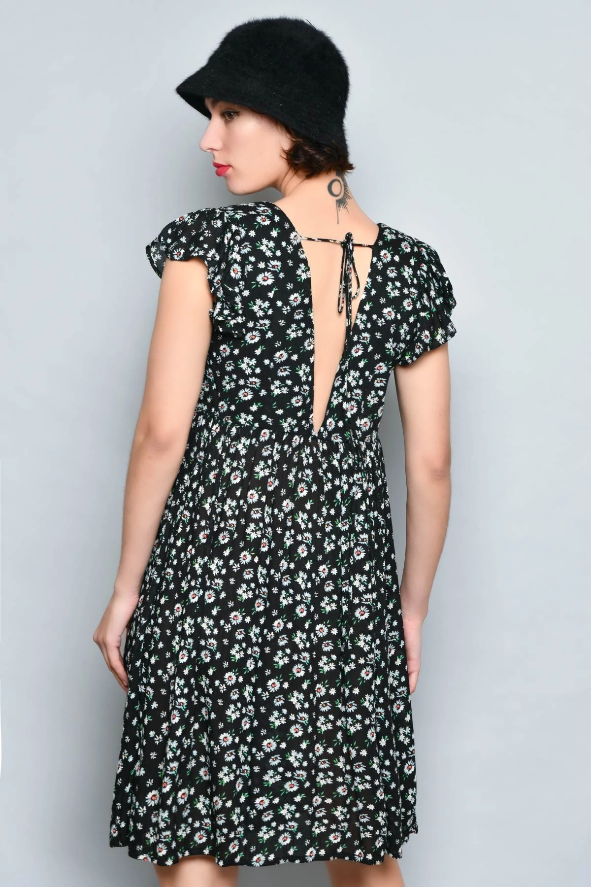 Abito corto estivo da donna in viscosa leggera in stile casual. Il modello ha scollo a V, manica corta con piccolo volant e schiena scoperta con laccetto regolabile. La linea è morbida e confortevole, ideale per le giornate calde. La fantasia floreale su fondo nero lo rende facile da indossare sia di giorno che la sera.