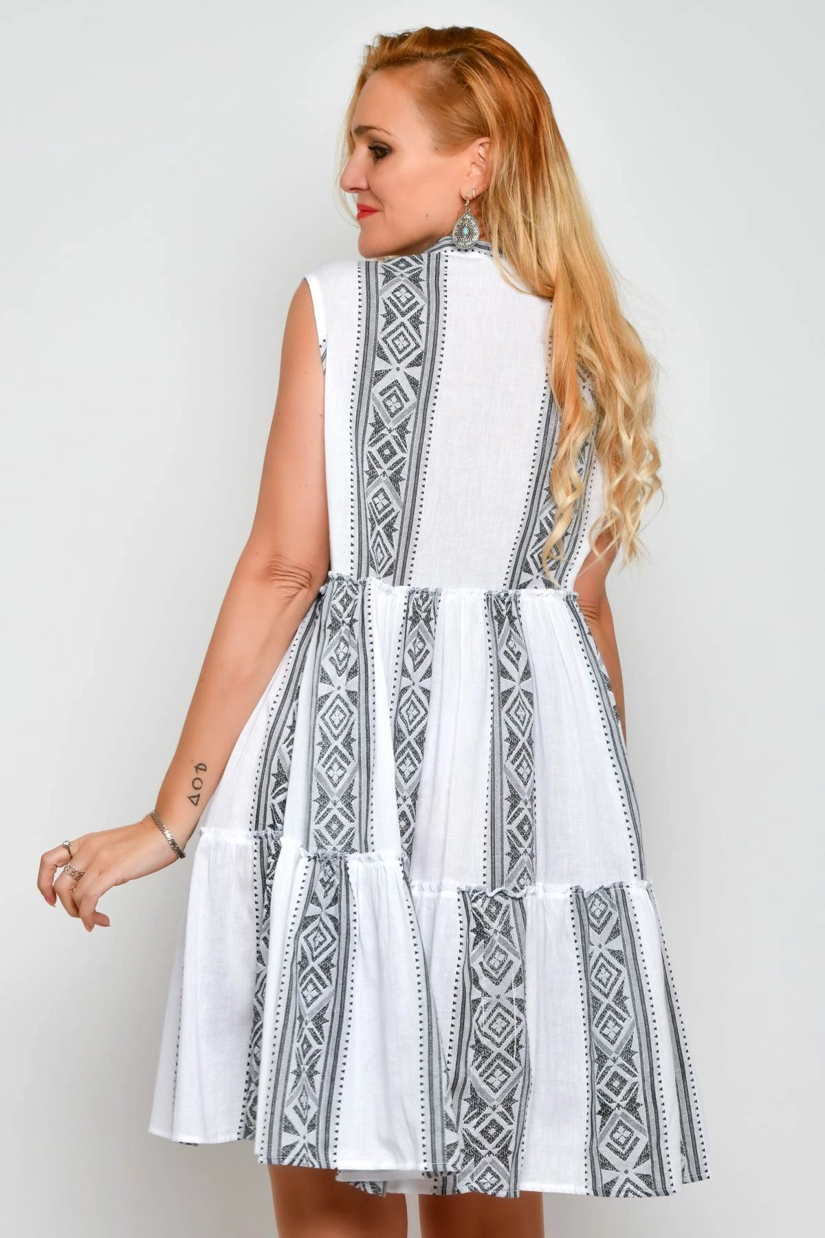 Il ricamo tape work sul davanti e il taglio in vita rendendo l’abito particolare e comodo da indossare tutto il giorno. Lo stile è etnico–Ibiza, perfetto per chi cerca un capo estivo originale. Il colore è bianco e nero facile da abbinare.