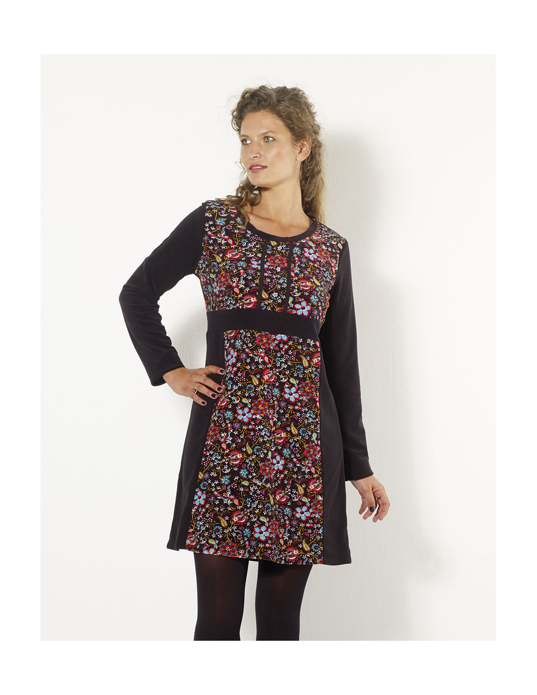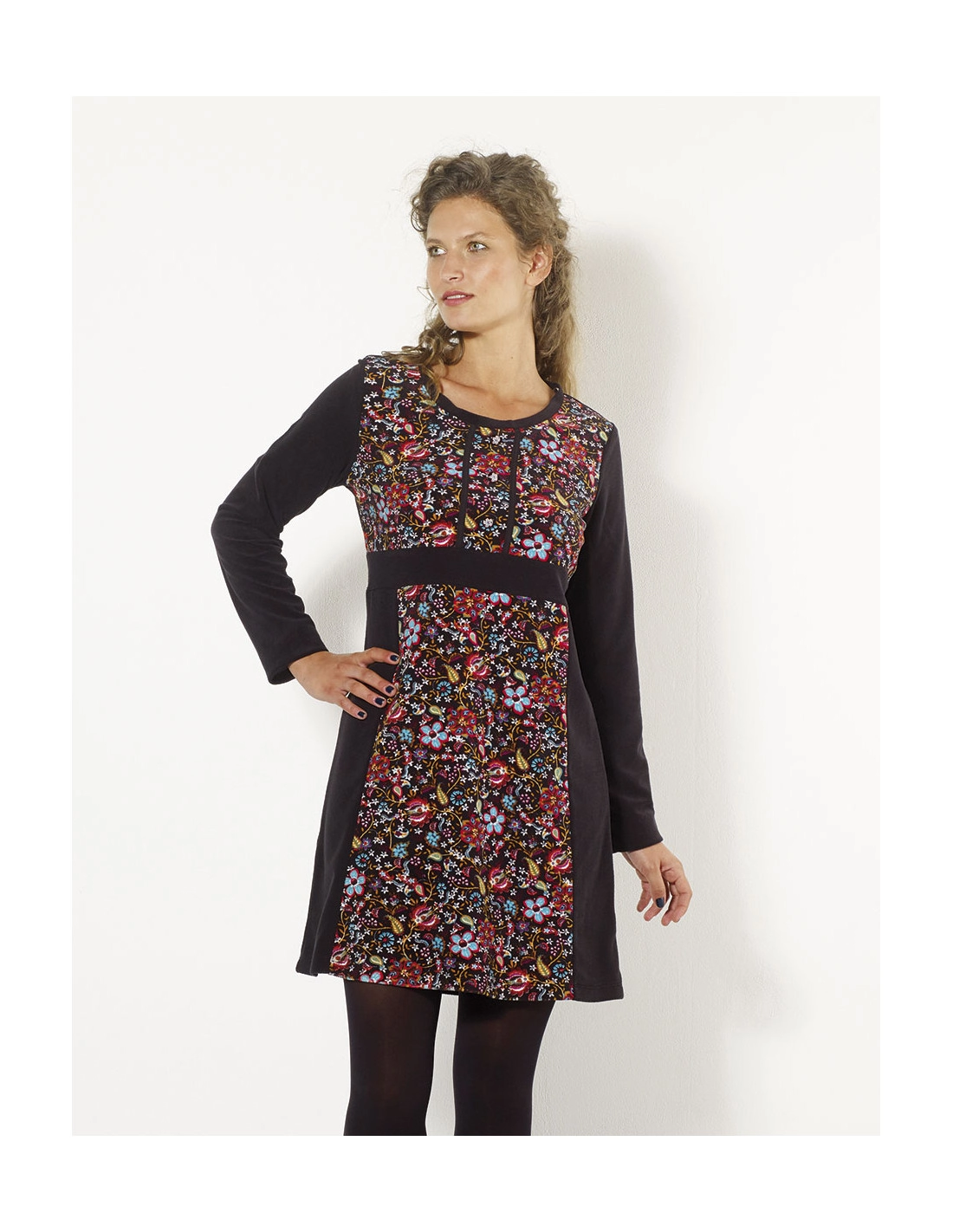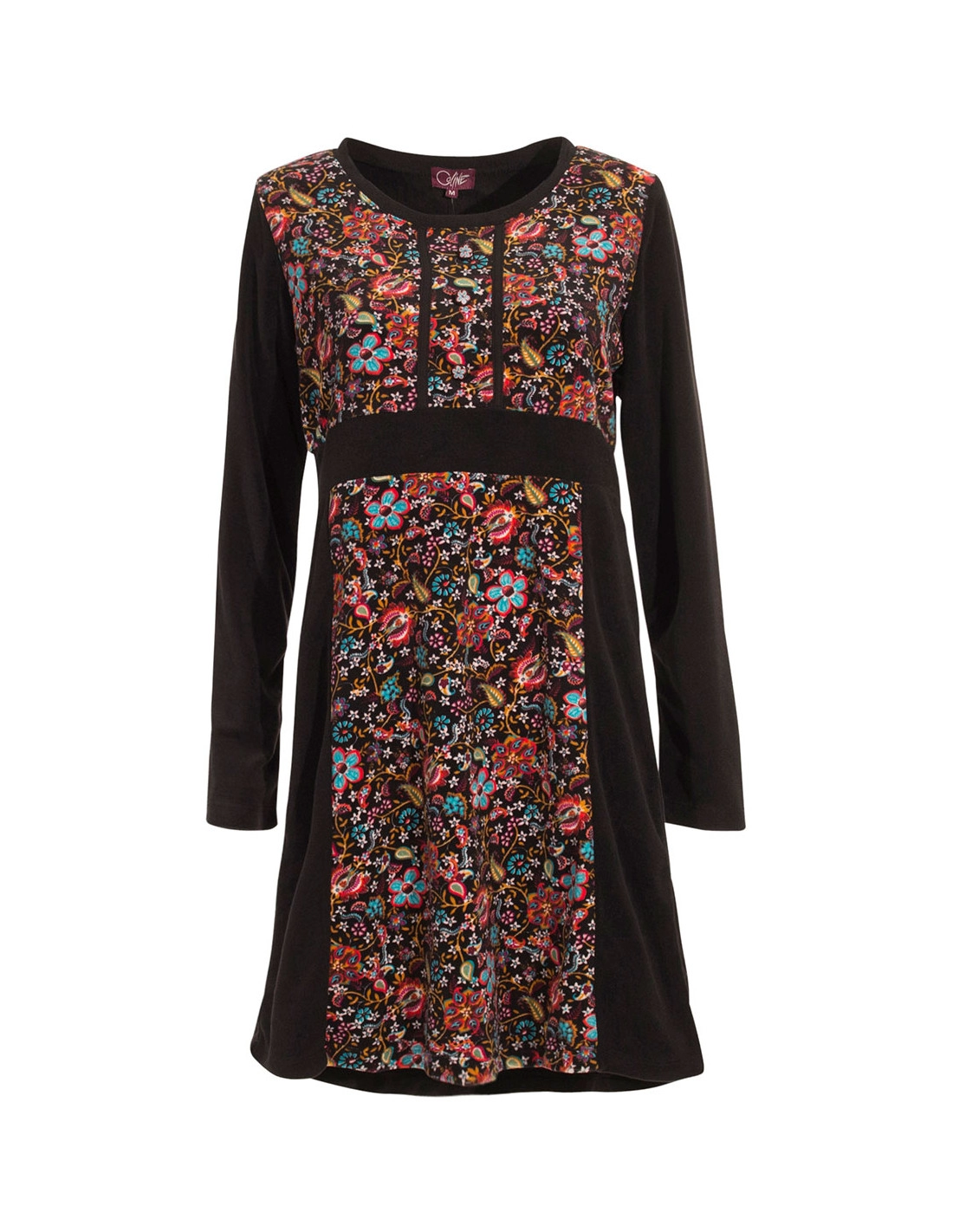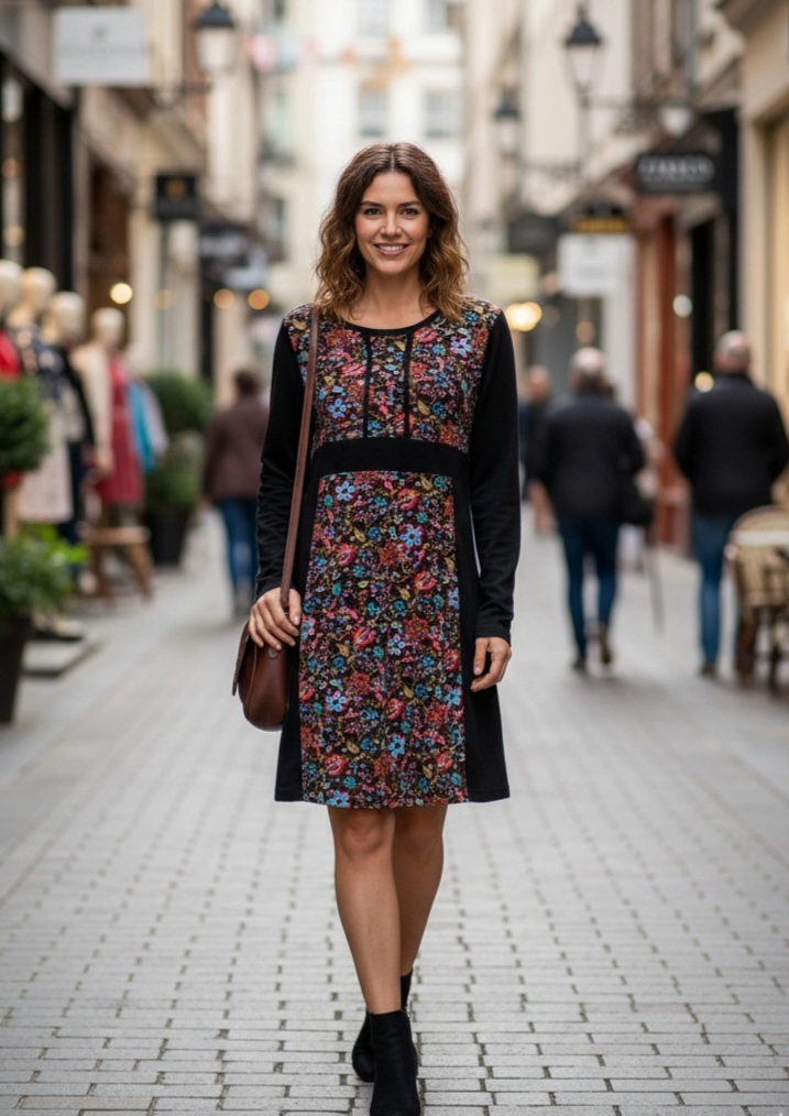Vestito femminile in tessuto vellutato, morbido al tatto e caldo, perfetto da abbinare facilmente sia a stivali che a scarpe. La stampa bohémien floreale sul davanti conferisce un stile unico e femminile, aggiungendo un tocco di eleganza boho al look.