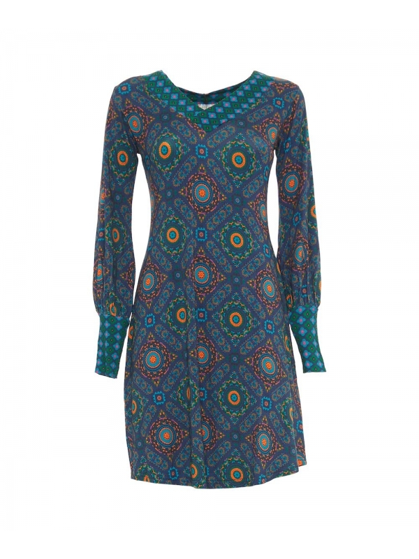 Abito in viscosa invernale caratterizzato da fantasia mandala su tutta la superficie e polsino stampato a contrasto che aggiunge un elemento decorativo tipico dello stile etnico. Il modello presenta scollo a V rifinito con bordo in stampa coordinata e linea leggermente svasata.