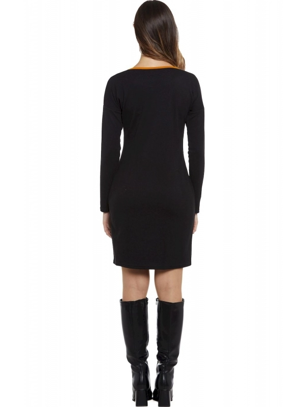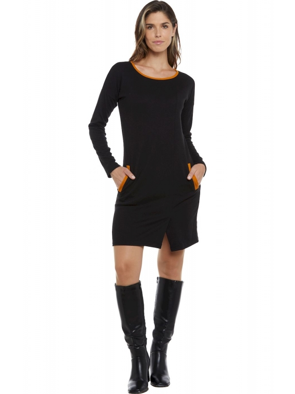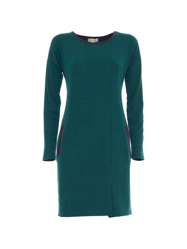 Abito a manica lunga della collezione invernale Baba Design, con piccolo spacco sul davanti. Girocollo semplice, rifinito in tinta con i dettagli delle tasche. Linea dritta, vestibilità comoda, senza zip o bottoni. Disponibile in nero o petrolio, in due taglie (consulta la guida alle taglie).