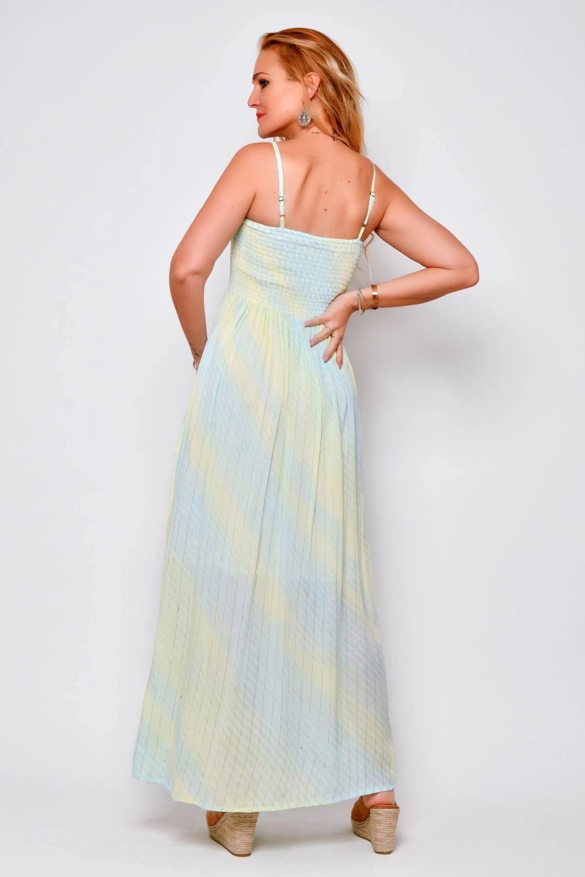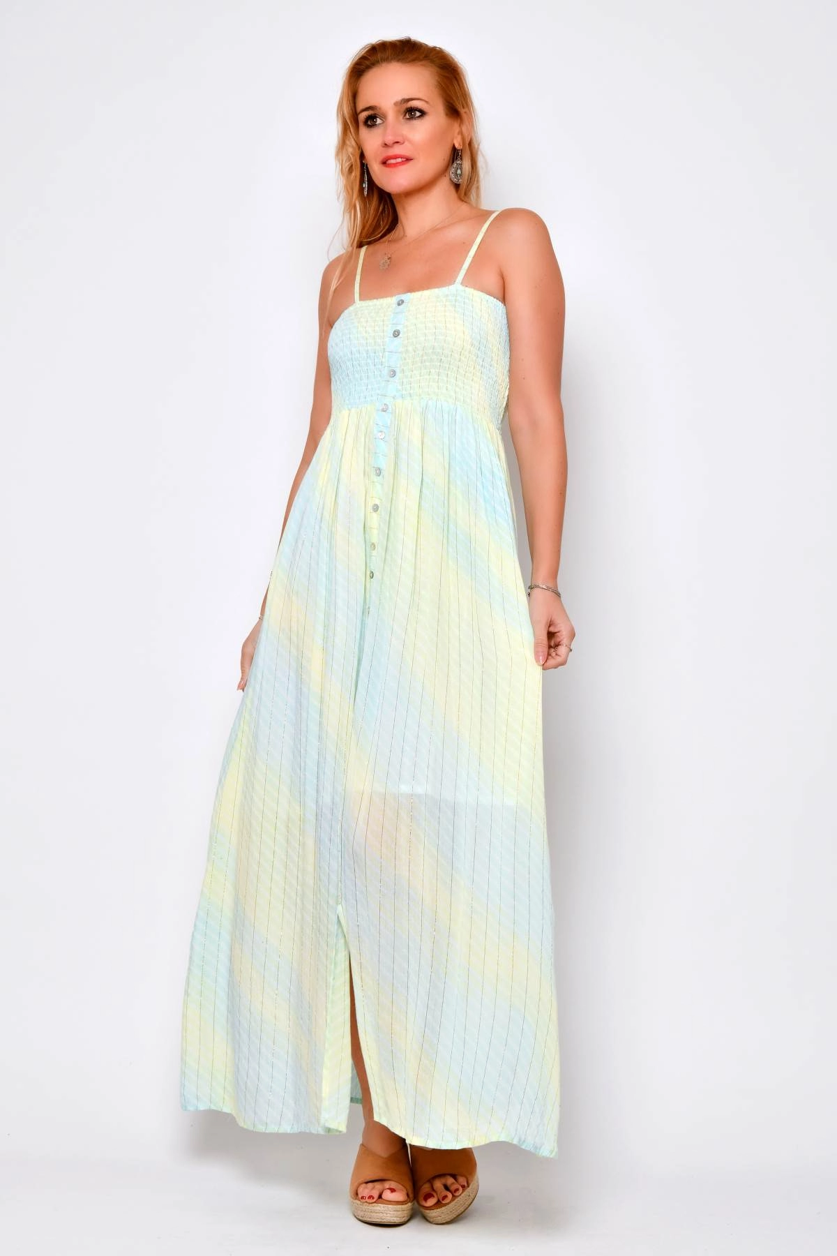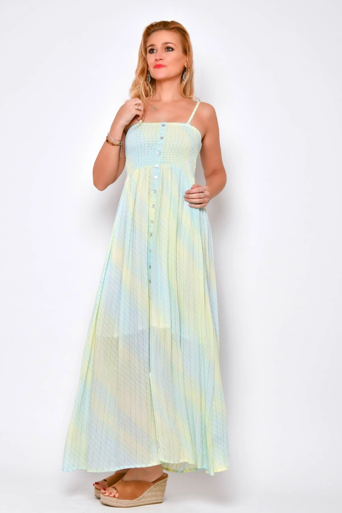 Abito lungo estivo da donna in viscosa leggera, con spalline sottili regolabili e busto elasticizzato che valorizza la figura. Il modello presenta spacco e bottoni applicati sul davanti e una linea fluida che scende morbida. Il tessuto è caratterizzato da una sfumatura delicata azzurro - verde con filo lurex dorato. Uno stile femminile e boho chic, perfetto sia per il giorno che per la sera.