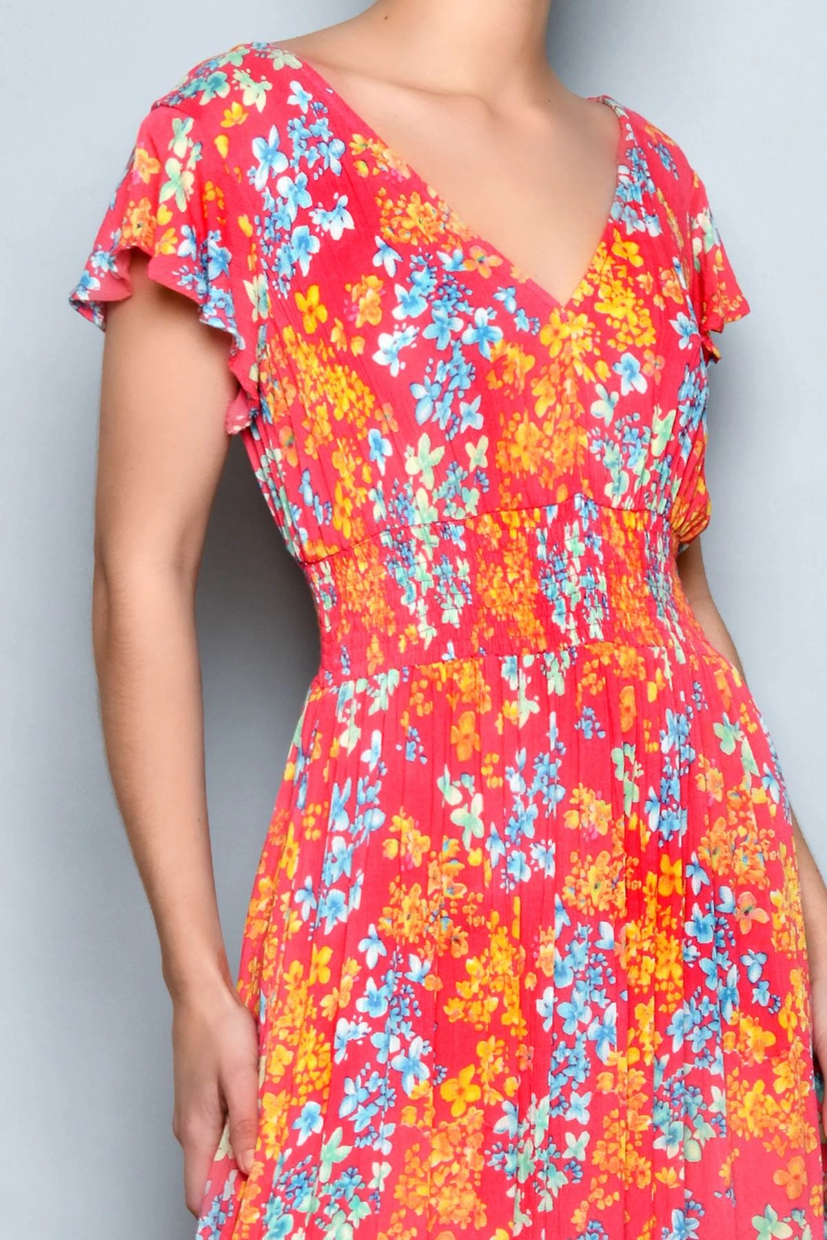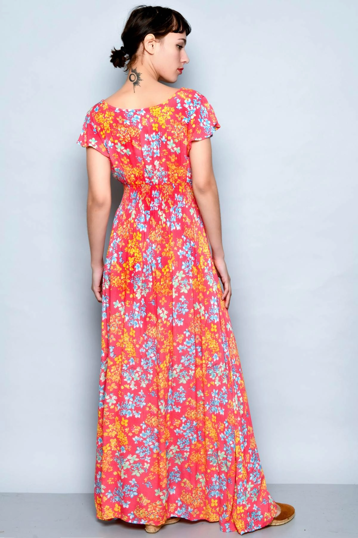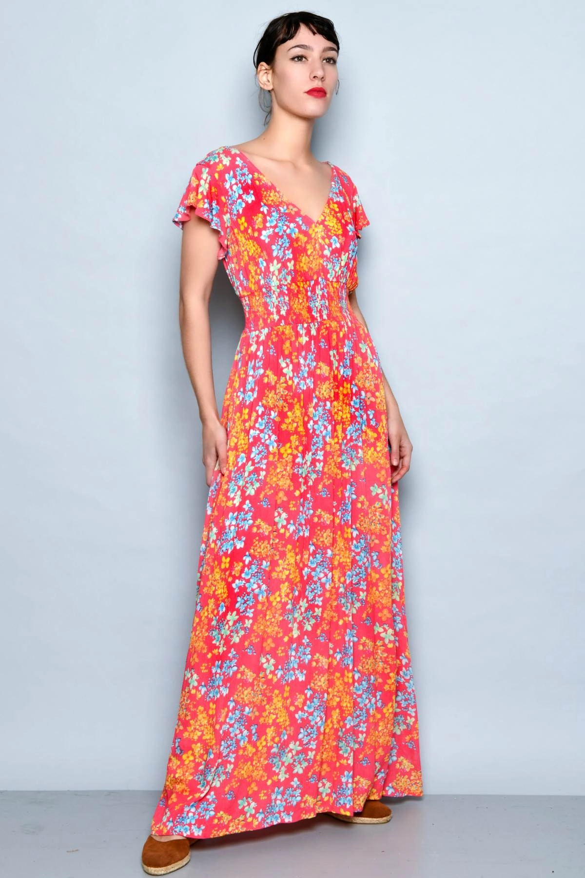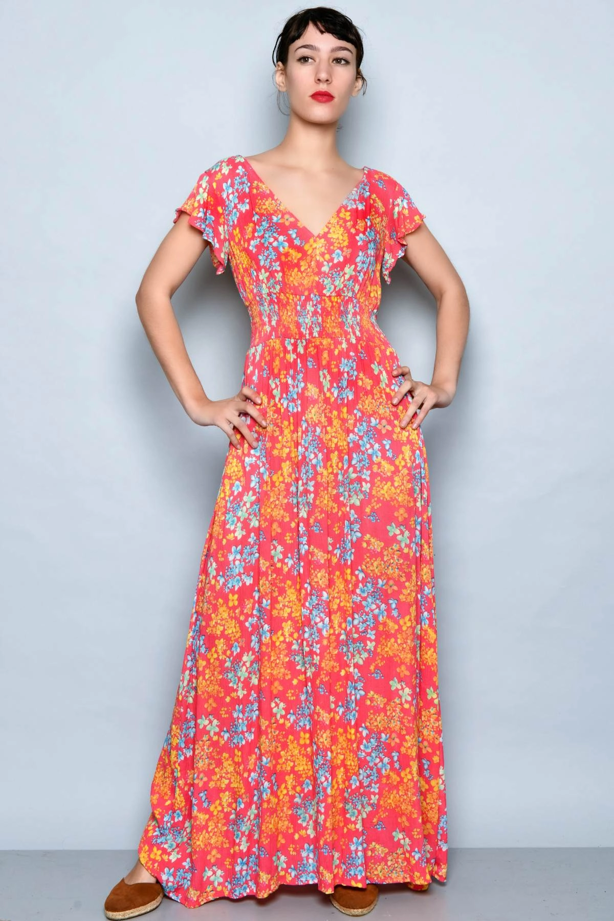 Abito lungo da donna in viscosa, con scollo a V e manica accennata. La linea è valorizzata dalla vita elasticizzata che accompagna la caduta fluida della gonna. La fantasia floreale su fondo rosa richiama uno stile boho chic, ideale per occasioni estive, vacanze o serate informali curate.