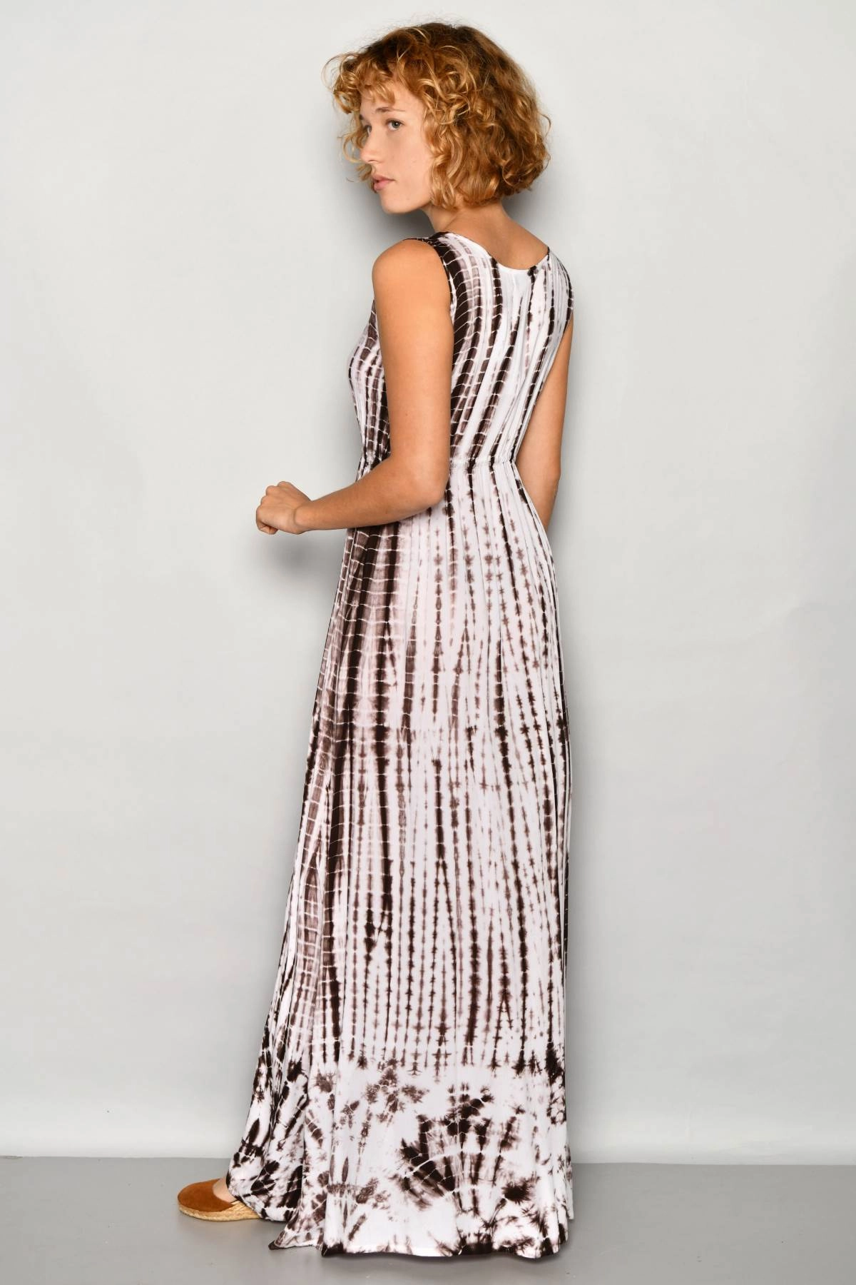 Abito lungo smanicato dallo stile Ibiza boho, caratterizzato da una stampa tie-dye sfumata nei toni del bianco e del marrone. Il taglio è fluido con scollo rotondo e linea che accompagna naturalmente la silhouette. Realizzato in viscosa leggera, è ideale per le giornate estive, le vacanze e il tempo libero.