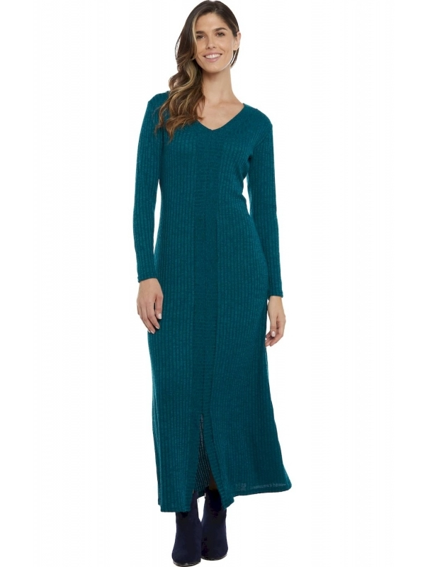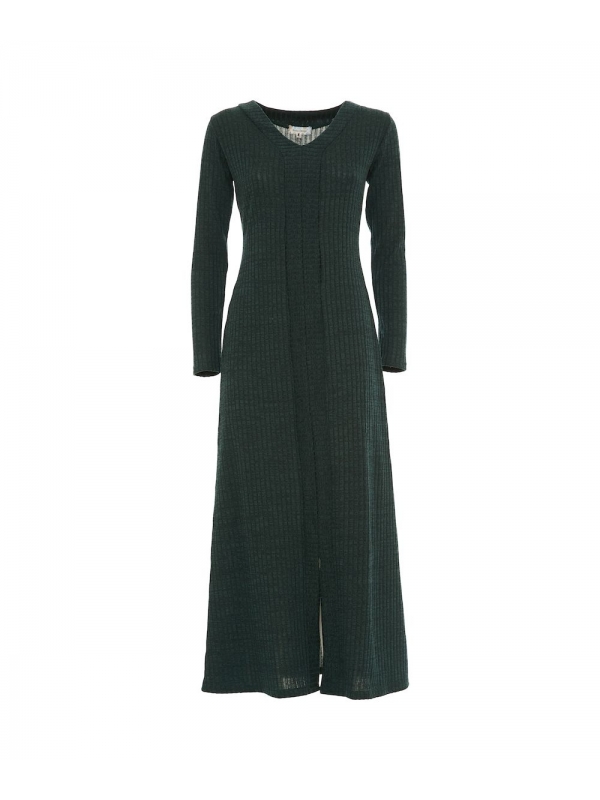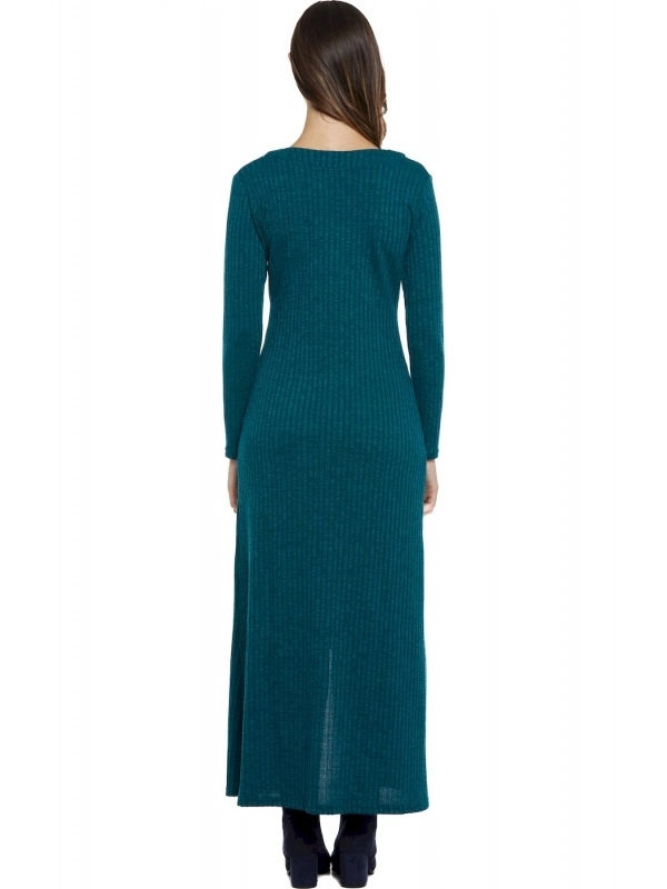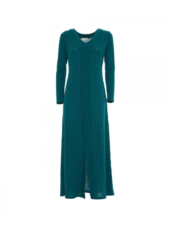 Abito lungo con lavorazione a coste verticali, scollo a V e piccolo spacco sul davanti che valorizza la figura. Il modello, in tinta unita, è proposto in due varianti colore: verde e ottanio. Linea semplice e femminile, adatta a un look quotidiano o da abbinare ad accessori per un effetto più ricercato.