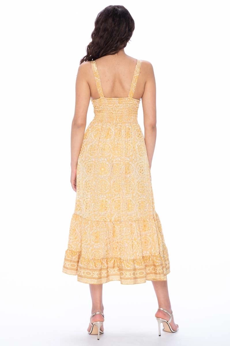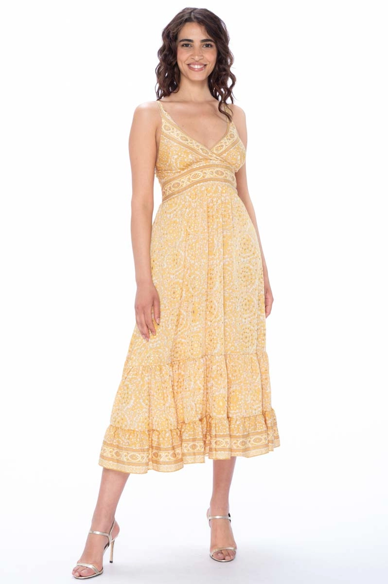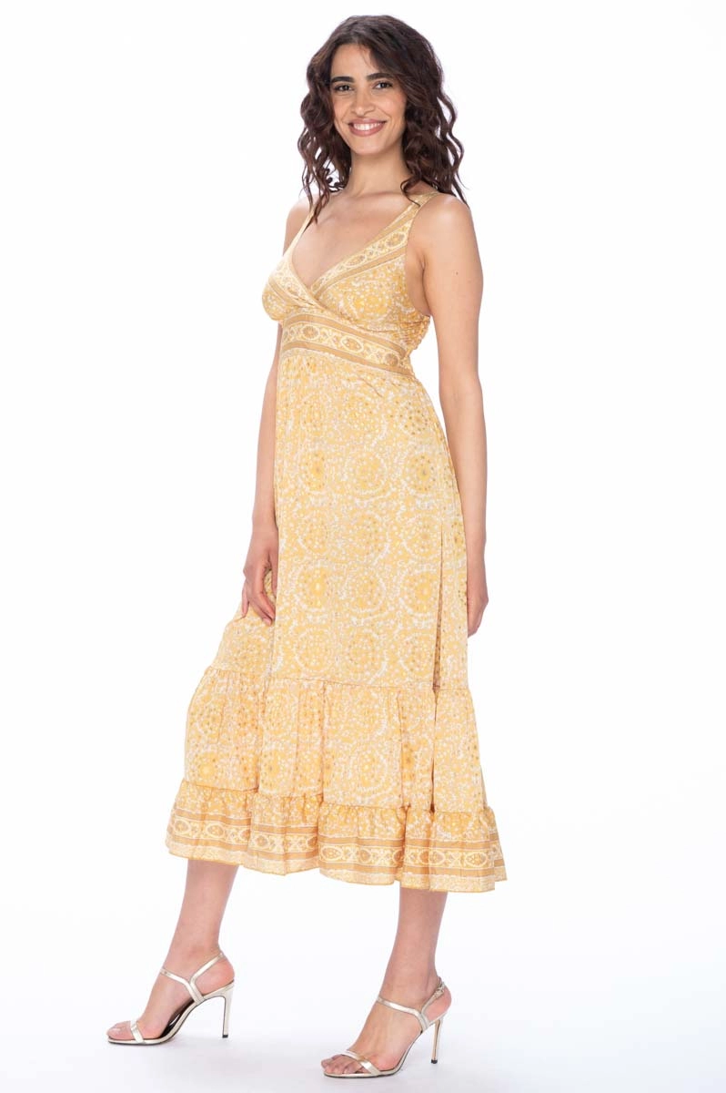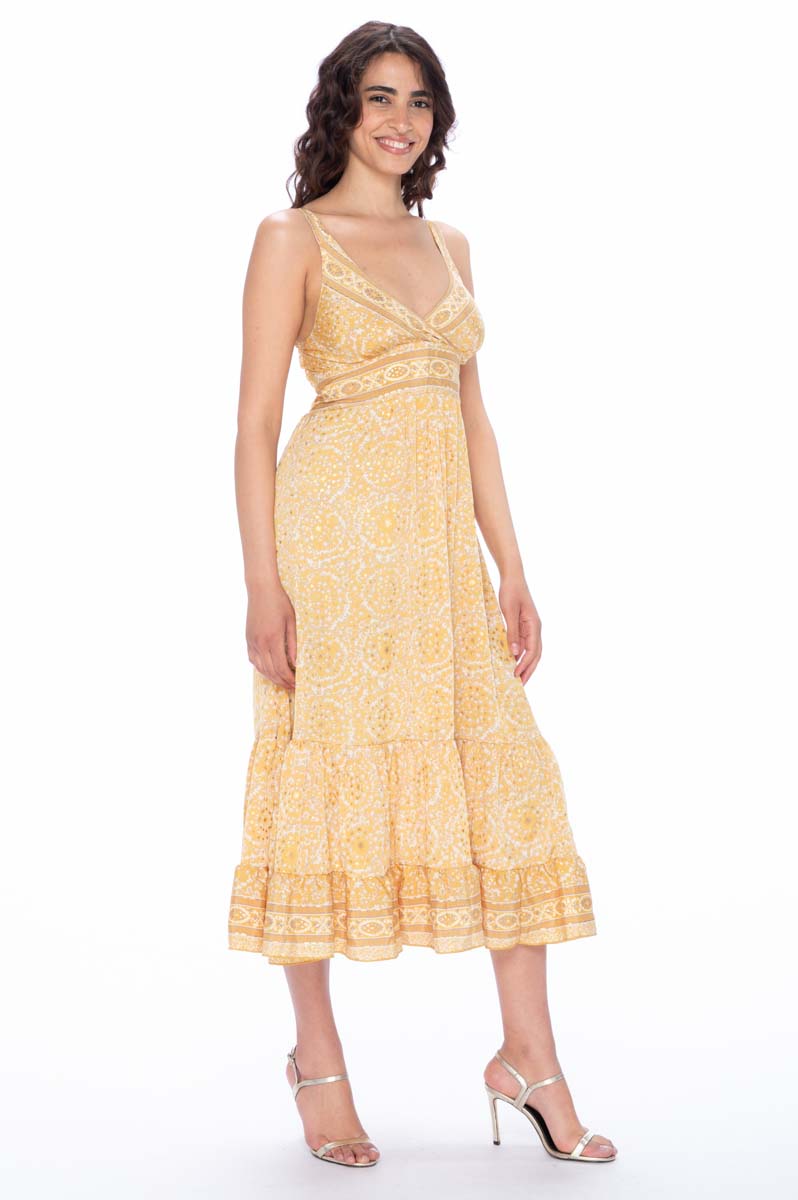 Abito midi in seta indiana fantasia con dettagli in oro, spalline e scollo a V incrociato che valorizza la parte alta del busto. La schiena è elasticizzata, mentre la gonna ha una balza ampia sul fondo. Questo vestito estivo donna è ideale per chi cerca un abito in seta leggero, fresco e facile da indossare nelle giornate più calde.