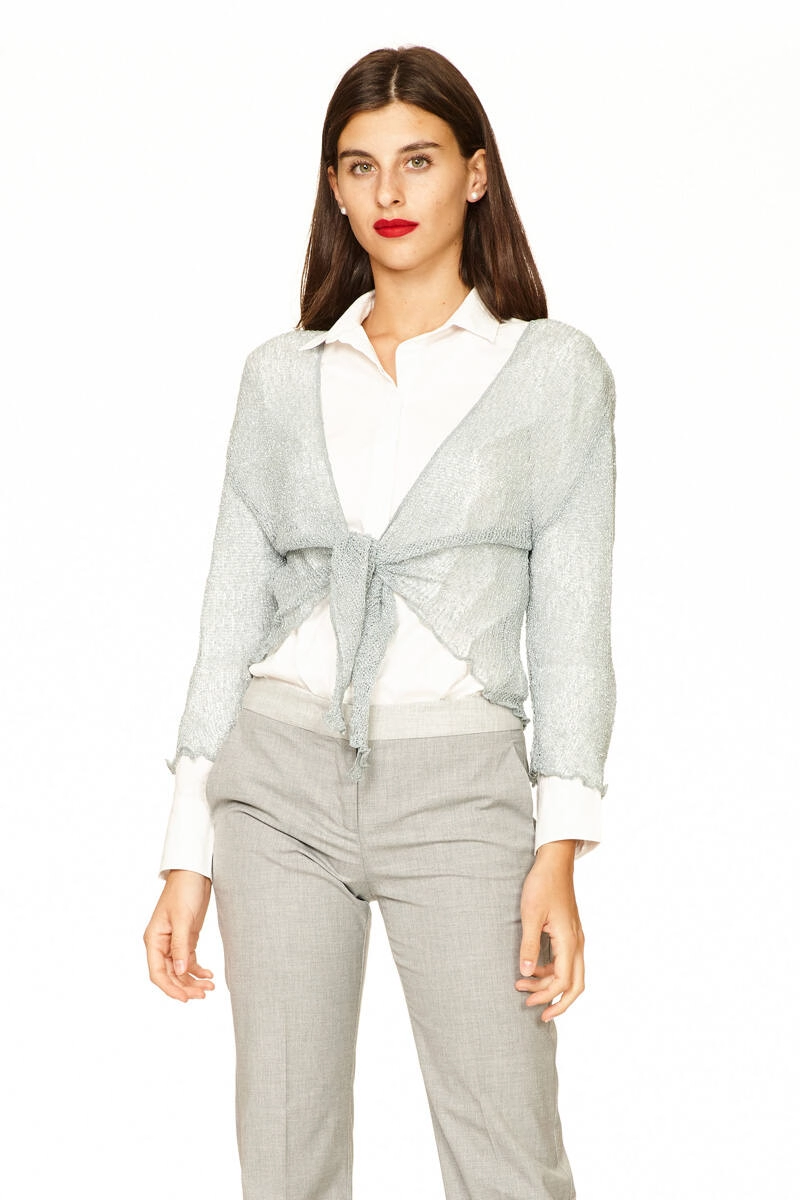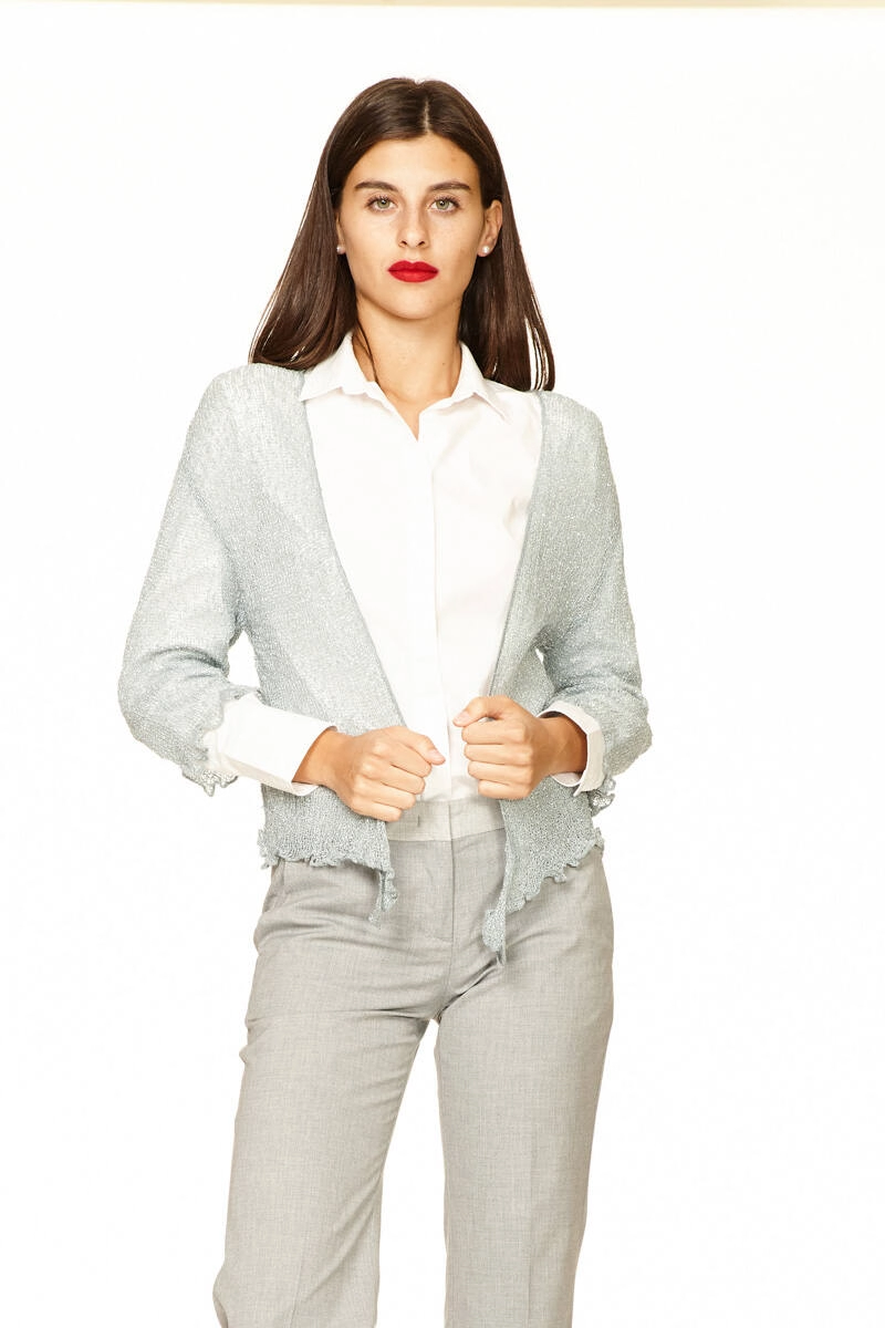 Lo Scaldacuore Silver Ghiaccio è realizzato in morbido tessuto retato con effetto Lurex, che aggiunge un tocco di luminosità e rende il capo elegante e chic. Questo Bolero può essere indossato come una giacca corta, aperto sul davanti, oppure allacciato con un semplice nodo, adattandosi a ogni occasione. Il colore Silver Ghiaccio è leggermente piu' chiaro rispetto al Bolero Silver Grafite.