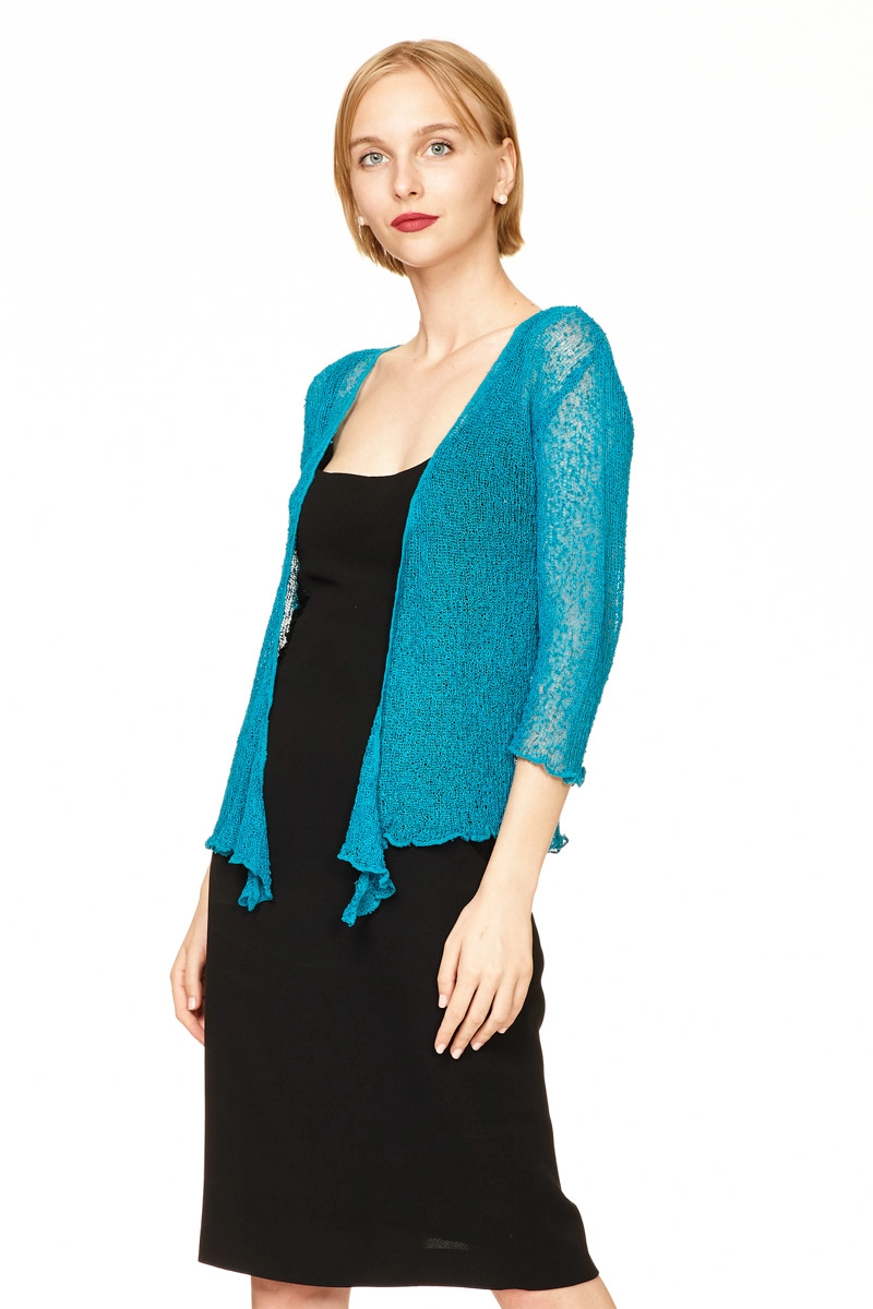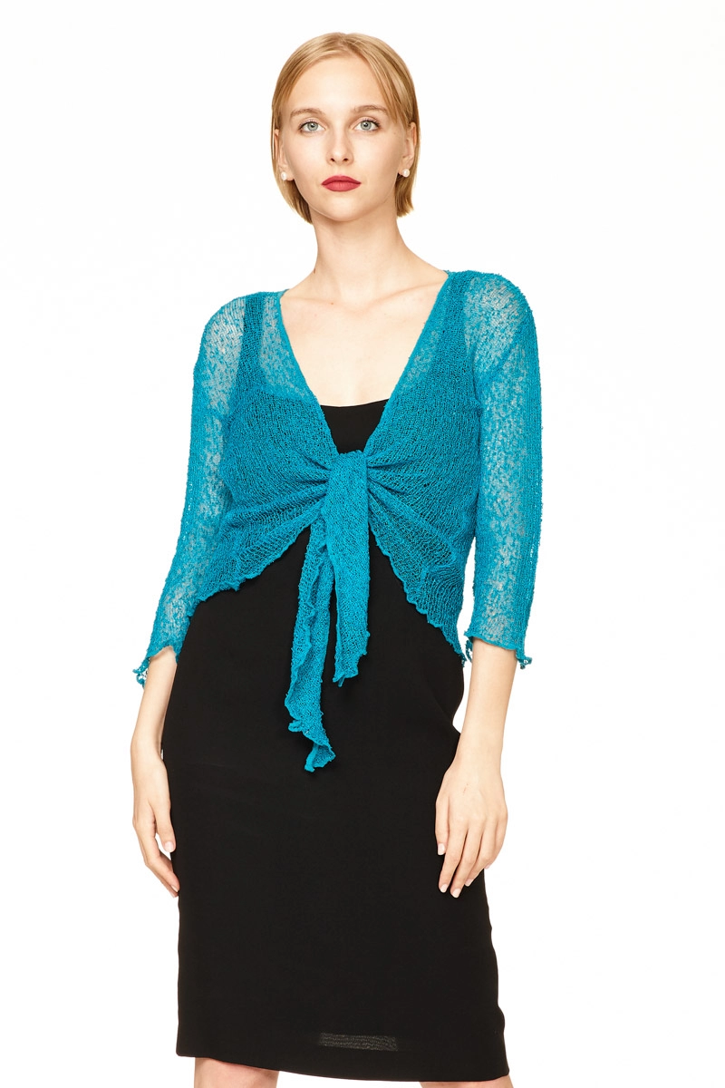 Un bolero estivo multifunzione, ideale per essere indossato in vari modi e per completare qualsiasi tipo di abbigliamento. Puoi usarlo aperto sul davanti come una giacca leggera o annodato per un tocco femminile.