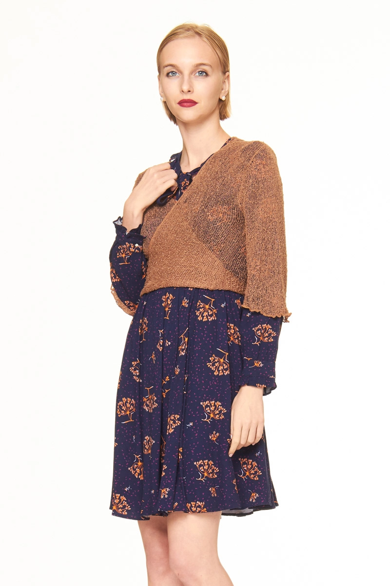 Bolero - Coprispalle - Scaldacuore Estivo Colore Tabacco. Coprispalle con manica a 3/4, realizzato in rayon, una fibra leggera e morbida ottenuta dalla cellulosa, ideale per i climi caldi. Il tessuto retato e traspirante garantisce comfort in ogni stagione. Il bolero estivo può essere indossato come giacca corta, aperto sul davanti, o allacciato con un nodo per un tocco femminile. Perfetto per abbinamenti casual, sportivi o cerimonie, si adatta facilmente a tutte le silhouette.Come abbinare il colore Tabacco? Questa tonalità calda si abbina armoniosamente con colori naturali come beige, crema e panna, o con tonalità decise come verde oliva, senape e blu denim per un contrasto originale.