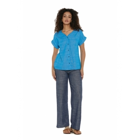 Camicia estiva realizzata in tessuto misto lino e cotone, leggera e traspirante, ideale per le giornate più calde. Il colore denim la rende facile da abbinare a pantaloni, gonne o shorts, creando look casual pratici .