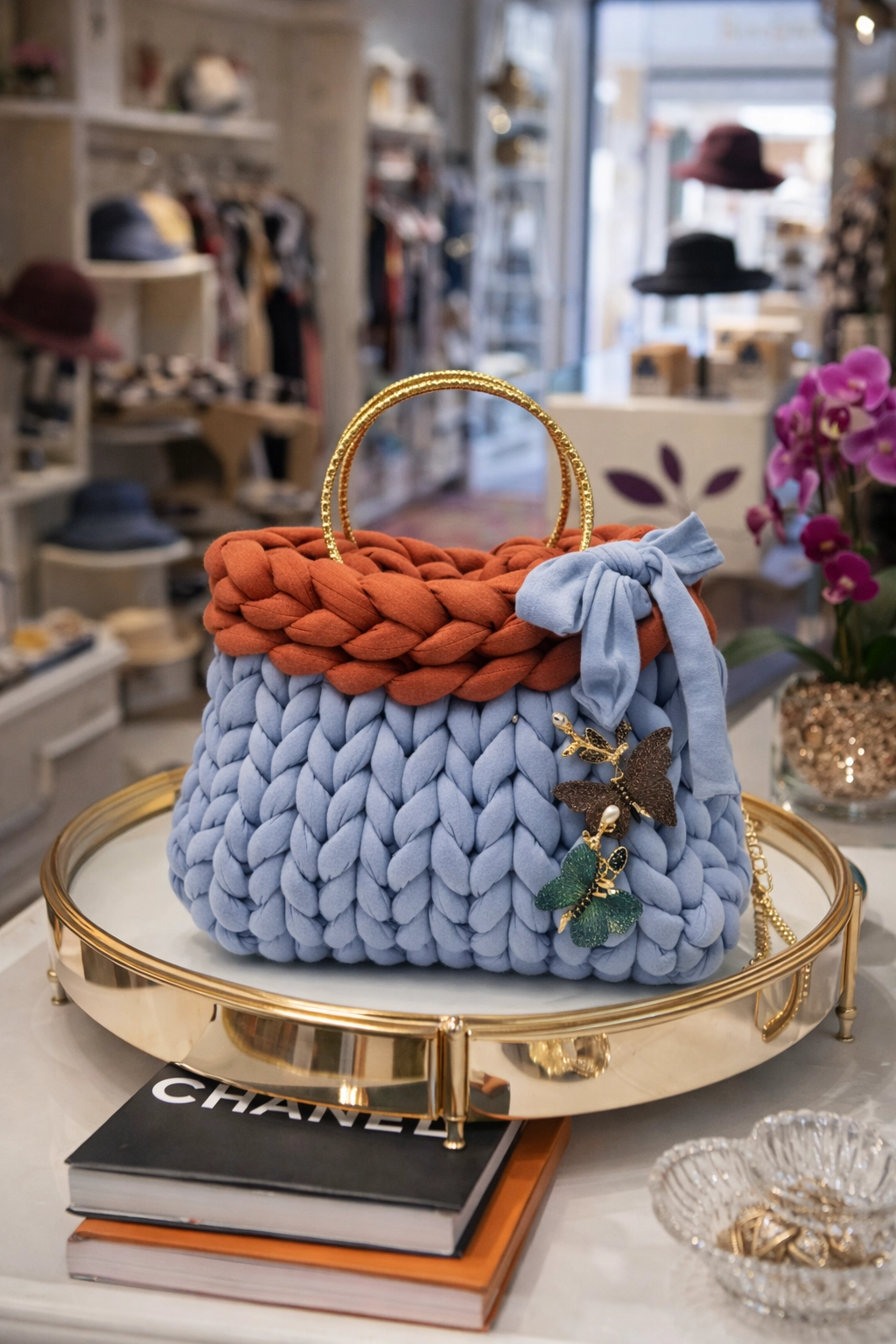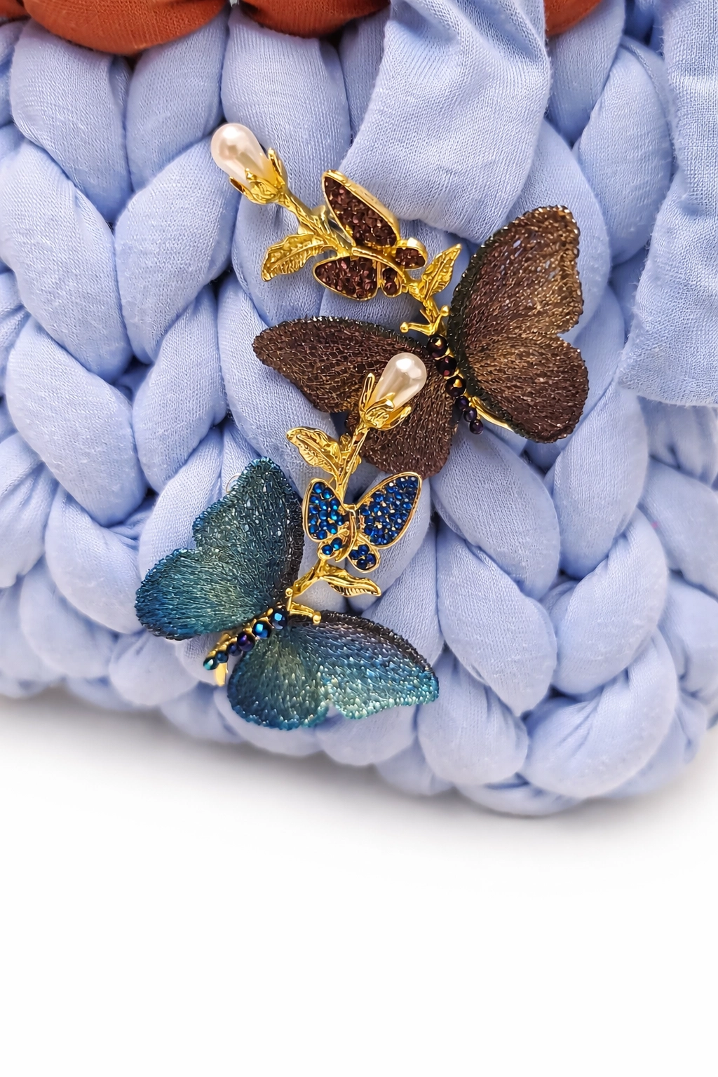 Questa Chunky bag di medie dimensioni è realizzata interamente con una lavorazione ad intreccio manuale, una tecnica artigianale che crea un effetto voluminoso, pieno e strutturato, risultando estremamente piacevole al tatto. La borsa è prodotta con un filato simil cotone di alta qualità nelle tonalità ruggine e azzurro, intrecciato con cura per ottenere una trama compatta che valorizza i volumi e definisce armoniosamente la forma del modello.
