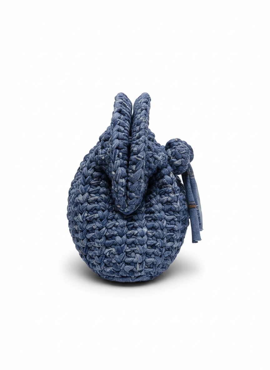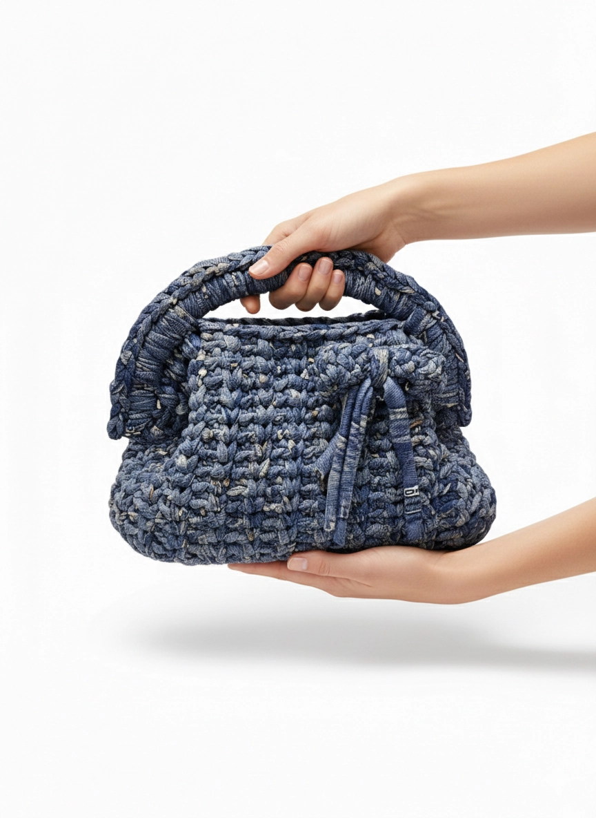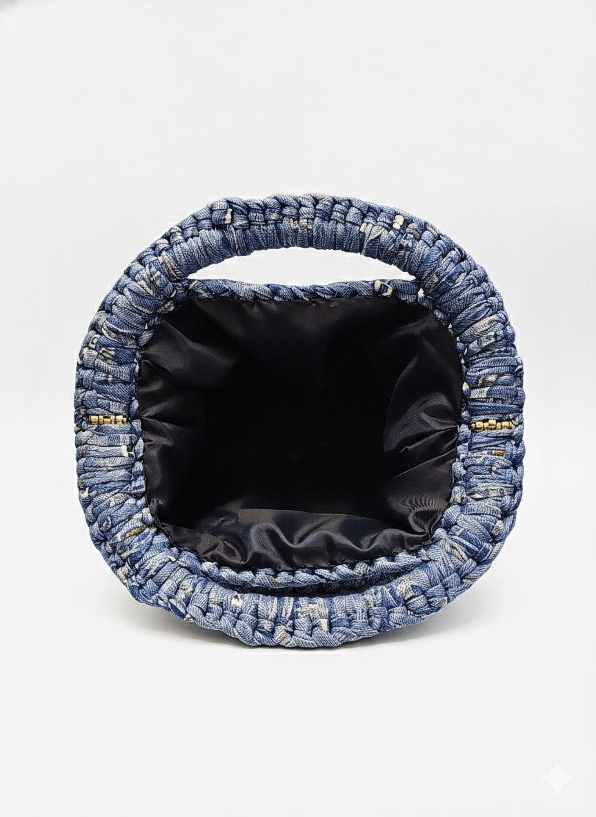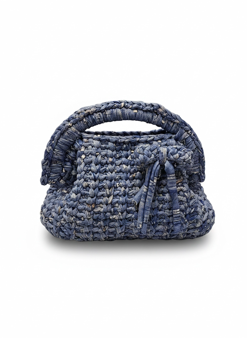 Clutch Bag artigianale lavorata ad uncinetto punto fantasia con un originale effetto jeans. Il modello è compatto, con chiusura a molla ad arco da 19 cm che garantisce un'ottima tenuta. È foderata internamente per una maggiore praticità ed è completata da una spilla decorativa removibile, che permette di personalizzare facilmente il look. Ideale come borsa a mano per il giorno o la sera, si abbina bene ad outfit casual.