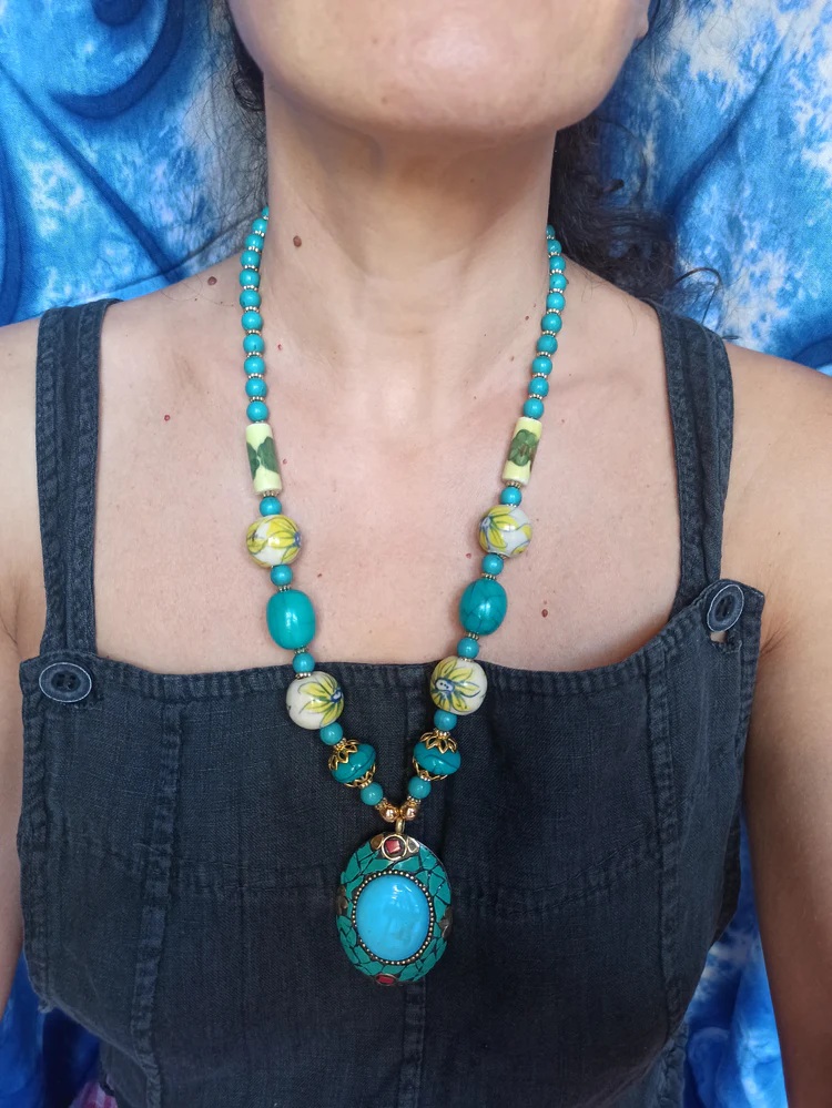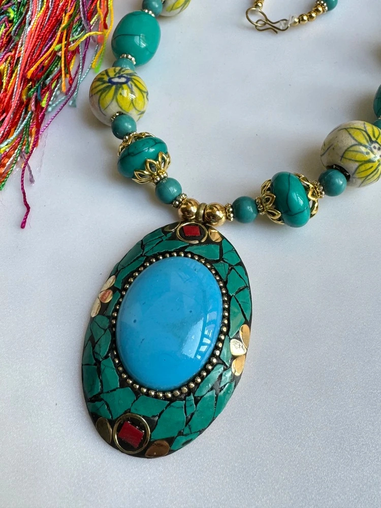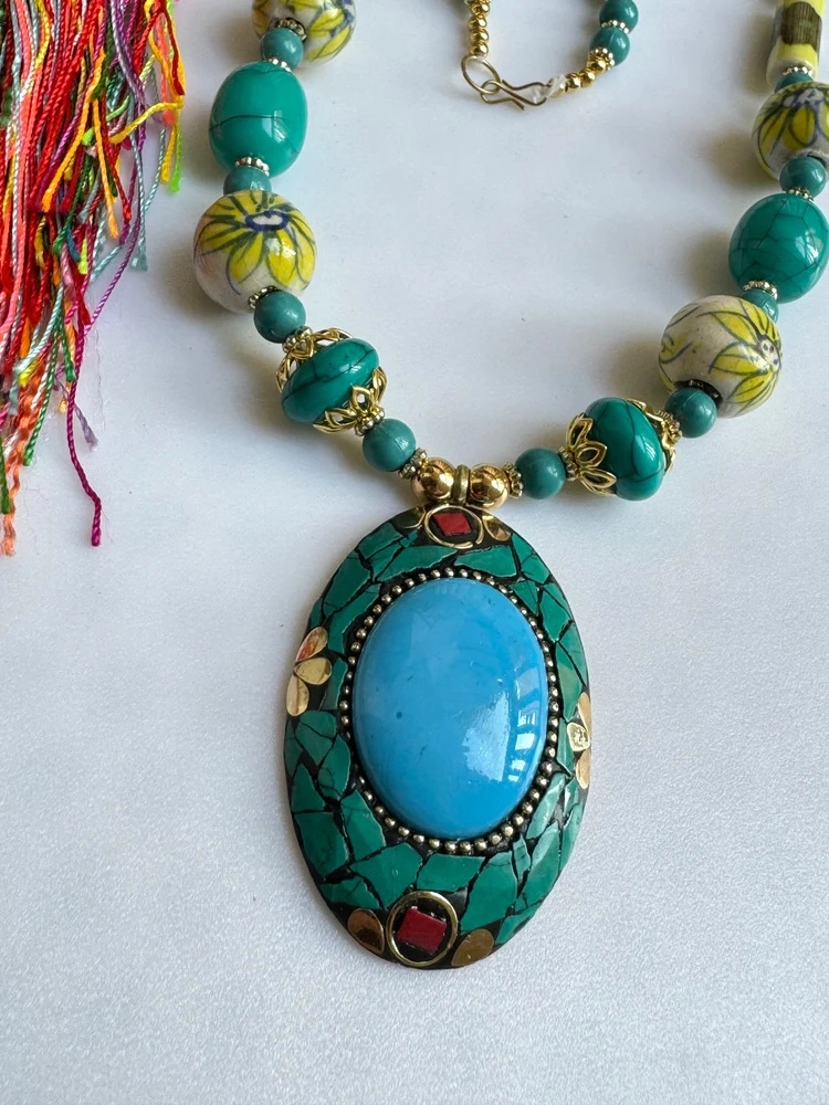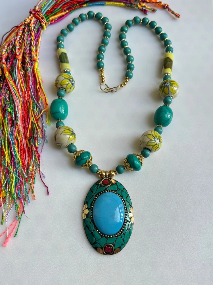 Collana lunga artigianale proveniente dal Nepal, realizzata a mano con inserti di diversi materiali e colori che si alternano creando un effetto etnico chic. Il cordone è arricchito da perle colorate e da un medaglione ovale con base dorata, chips rosse e turchesi e un inserto centrale in resina celeste.