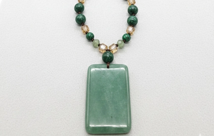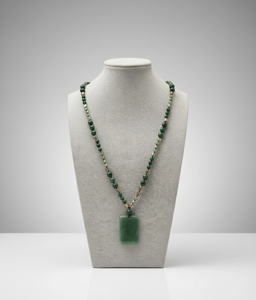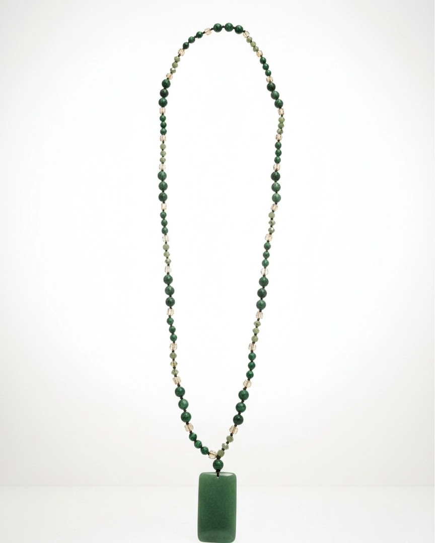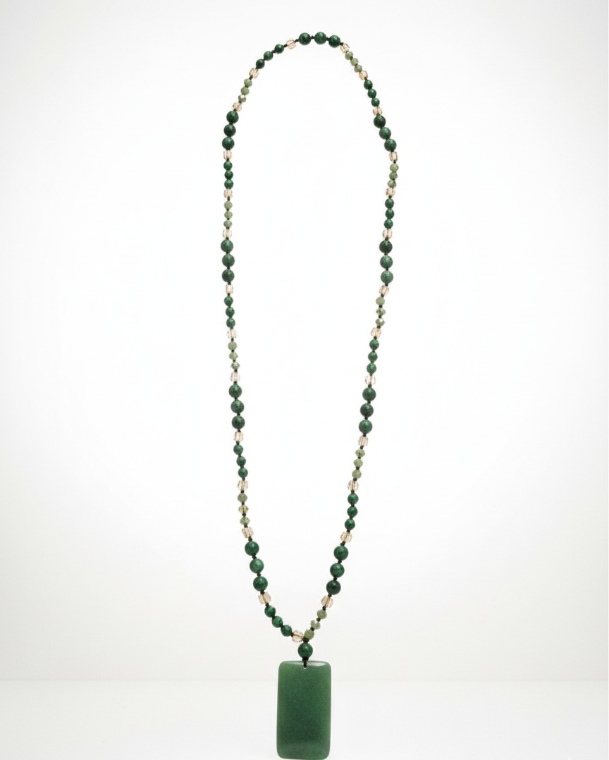 Collana lunga artigianale realizzata in Nepal con elementi tradizionali in resina, ottone e pietre ricostruite nei toni del rosso, turchese, ambra e legno. Il grande medaglione centrale, lavorato a mosaico con chips rosse e turchesi su base dorata, richiama simboli di protezione e prosperità della cultura himalayana. Ogni inserto è posizionato a mano secondo tecniche artigianali tradizionali.