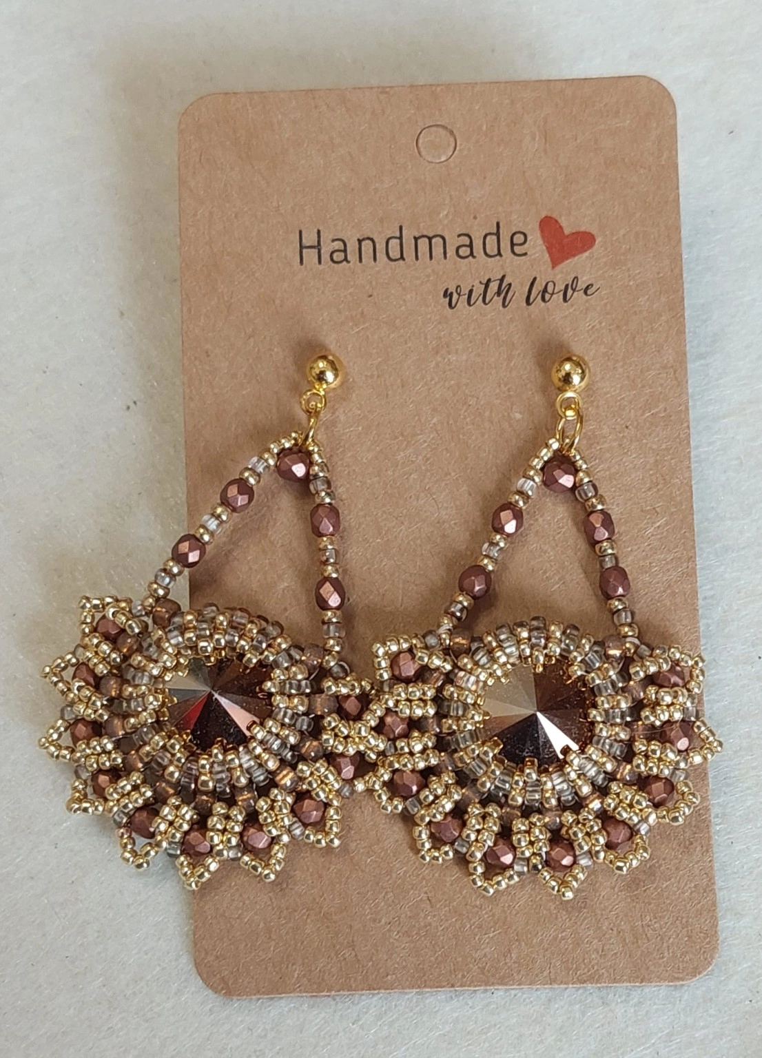 Orecchini luminosi realizzati con tecnica di tessitura a perline, impreziositi da un cristallo centrale da 14 mm in tonalità rose gold. Il gioco di riflessi caldi è esaltato da perline oro e mezzi cristalli bronzo che conferiscono luce. Il perno a lobo in acciaio garantisce comfort per tutta la giornata.