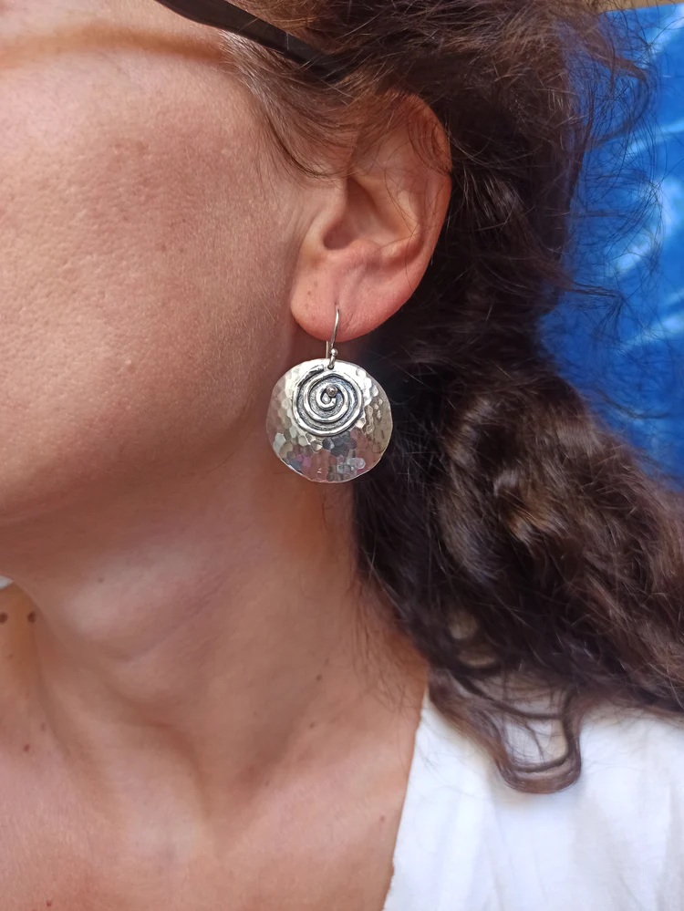 Orecchini pendenti dallo stile boho, realizzati in ottone argentato anallergico. La lavorazione martellata e la spirale centrale donano movimento e personalità al gioiello.