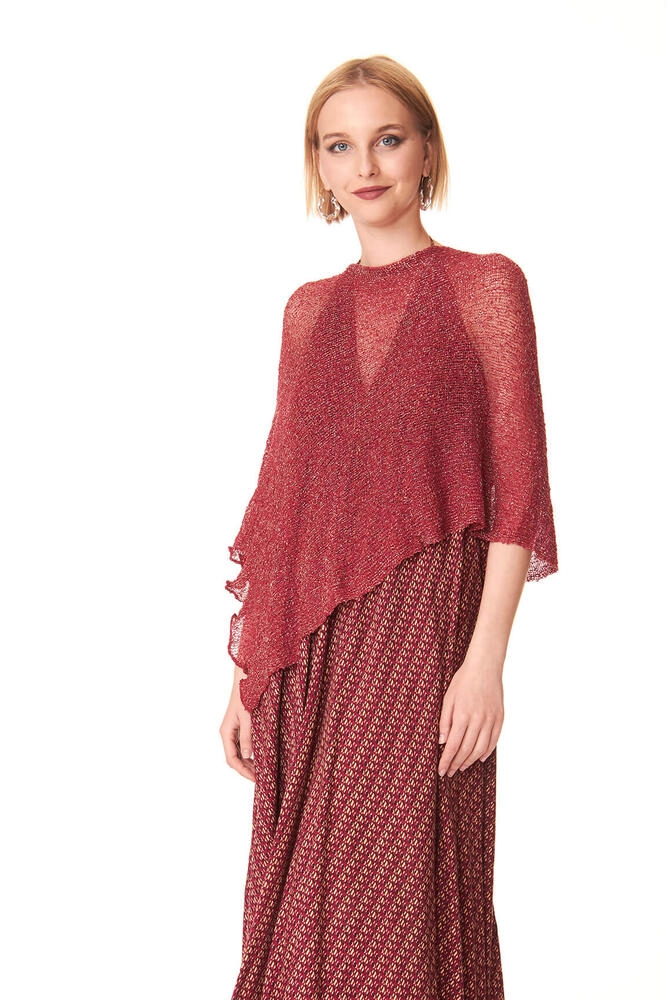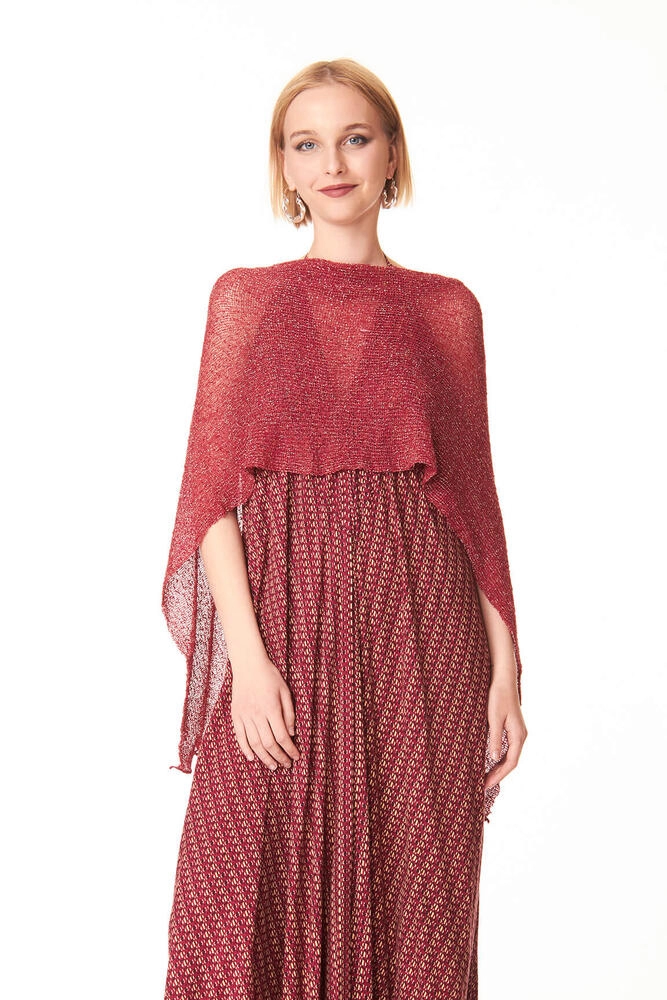 Il Ponchetto Sangria è realizzato in rayon, una fibra tessile vegetale apprezzata per la sua morbidezza e leggerezza, arricchito con filato Lurex dorato. Il Lurex è una fibra metallica sottile e brillante che dona luminosità al tessuto senza appesantirlo, rendendo il capo unico e originale.