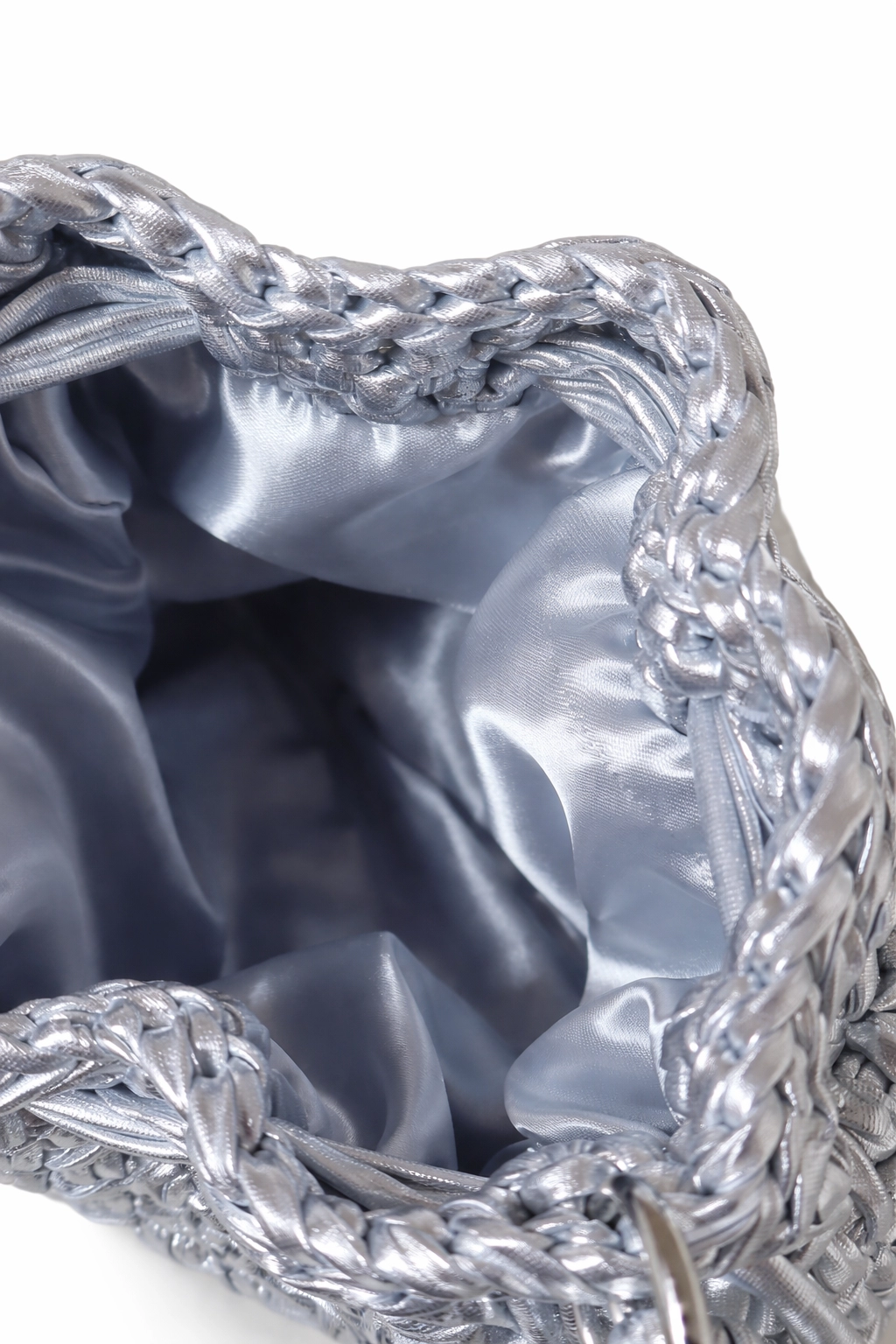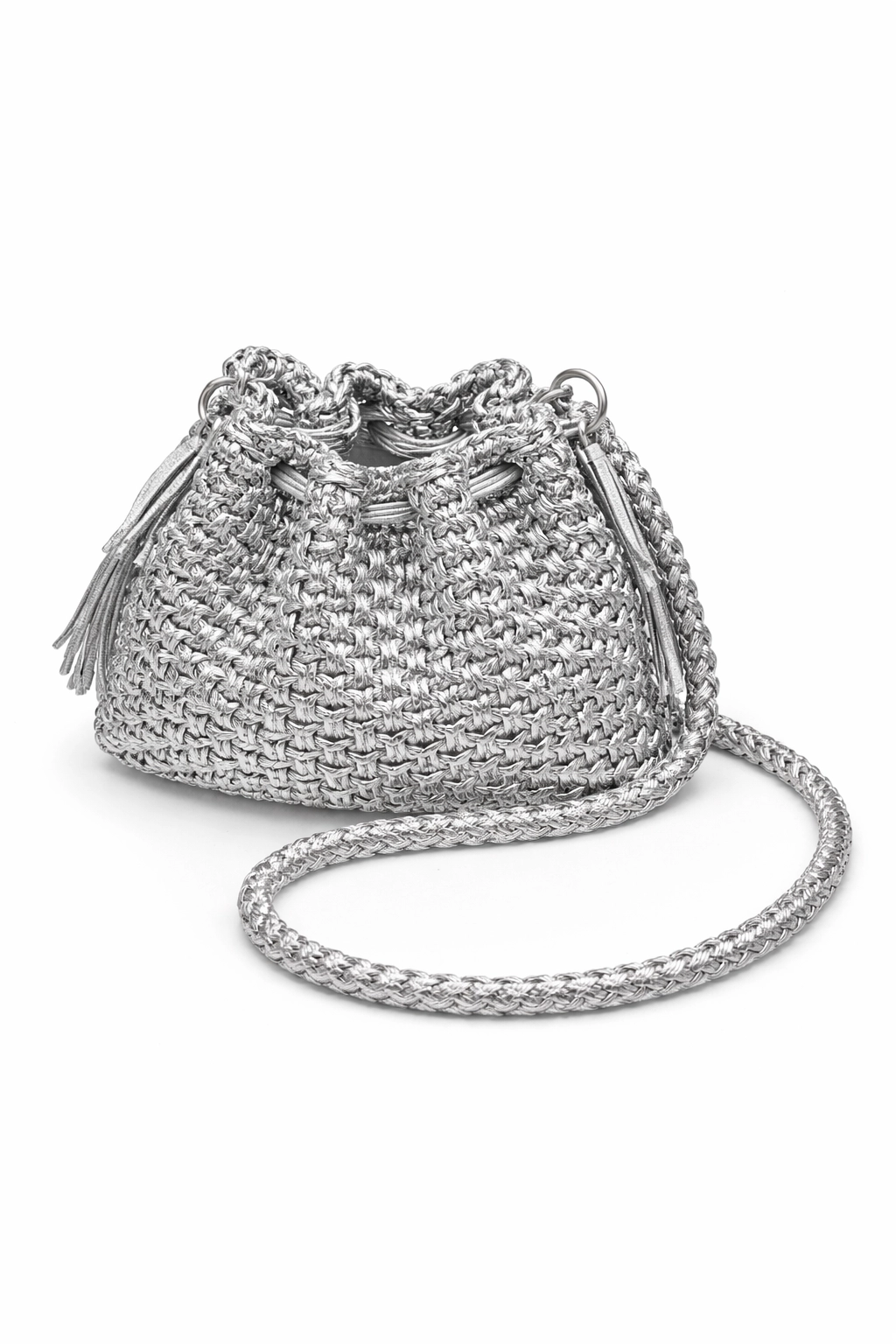 Pouch Bag lavorata ad uncinetto in filato metal argento, realizzata con una trama compatta e regolare che valorizza la lavorazione manuale. Il modello è morbido ma strutturato, con chiusura a coulisse che permette di regolare l’apertura in modo pratico.