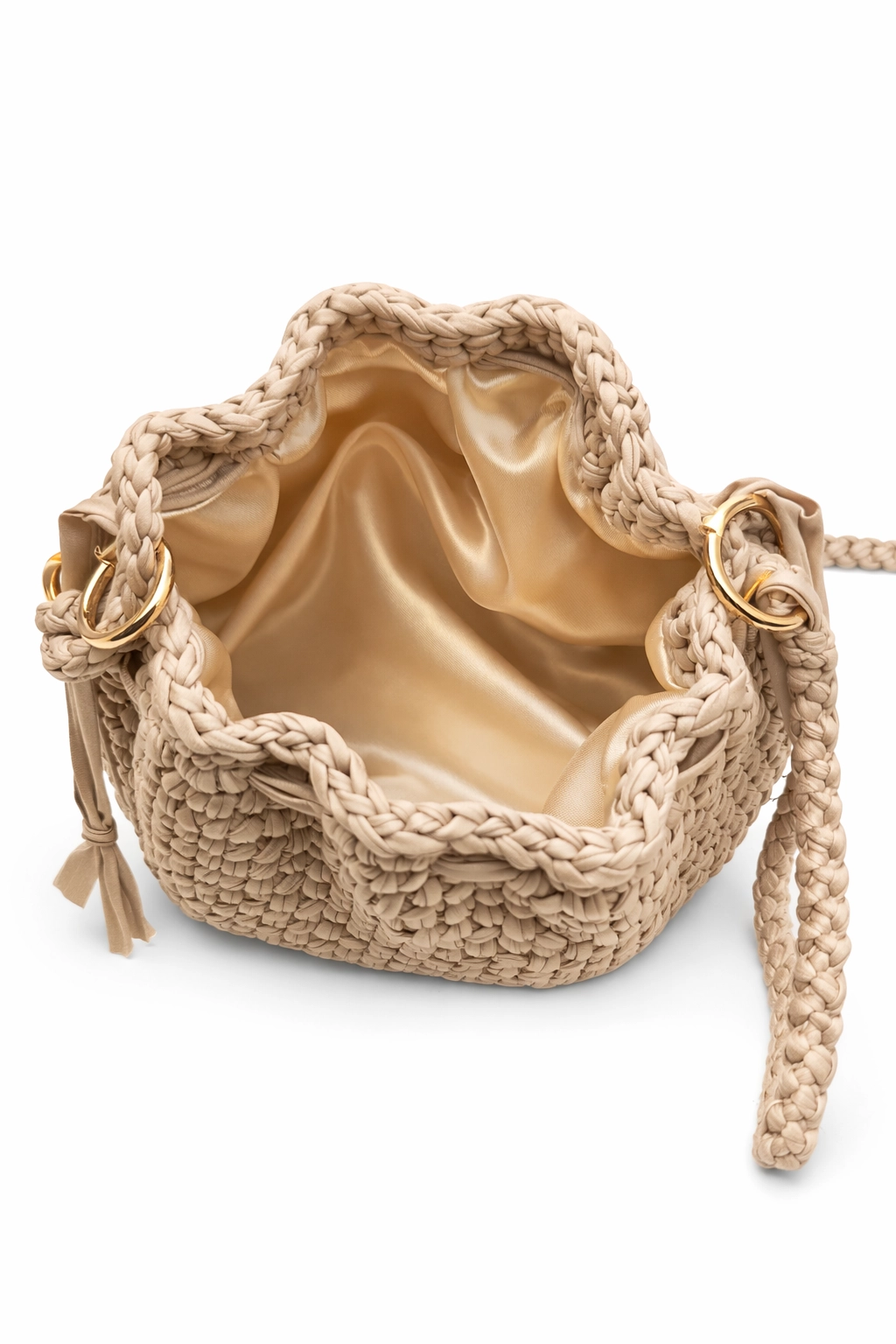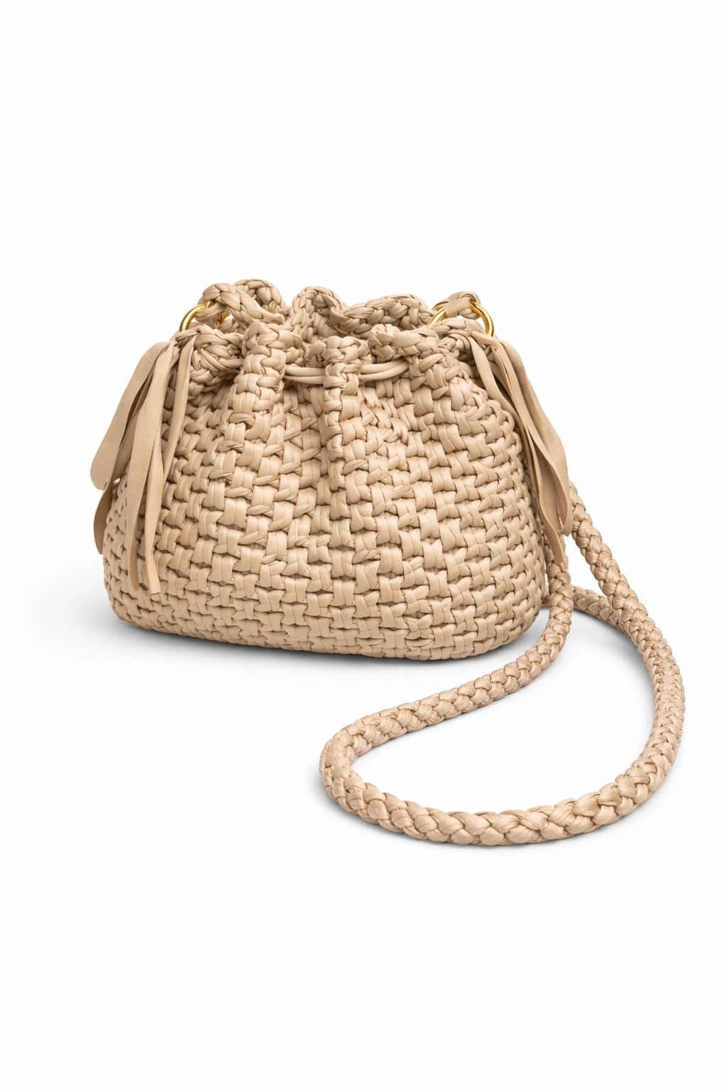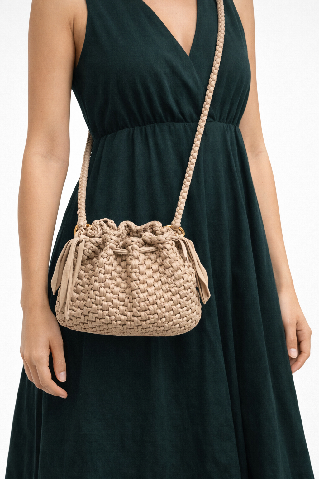 La tracolla lunga ad uncinetto (circa 110 cm) consente di indossarla comodamente a spalla o crossbody. Le dimensioni compatte la rendono ideale per accompagnare outfit chiari e naturali, sia di giorno che di sera.