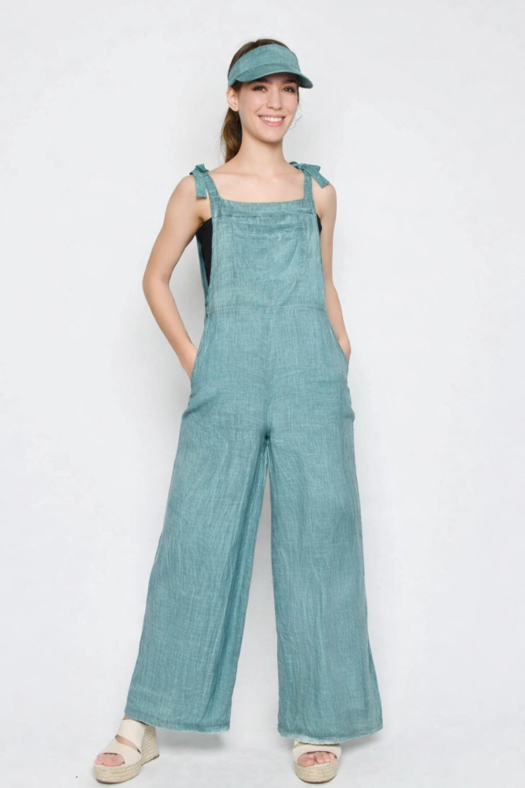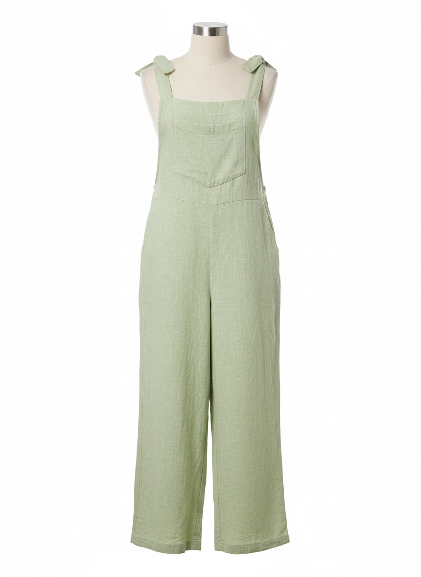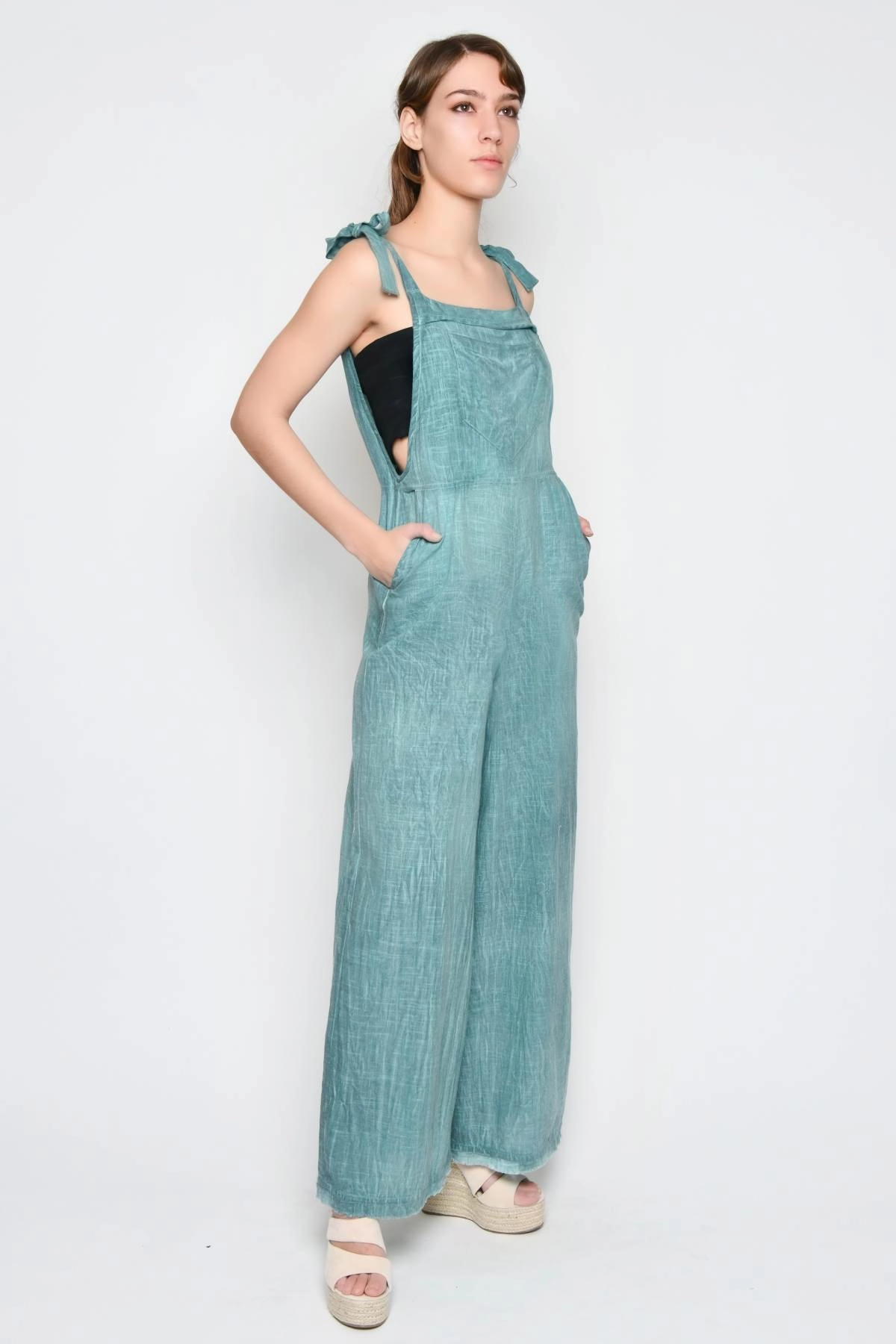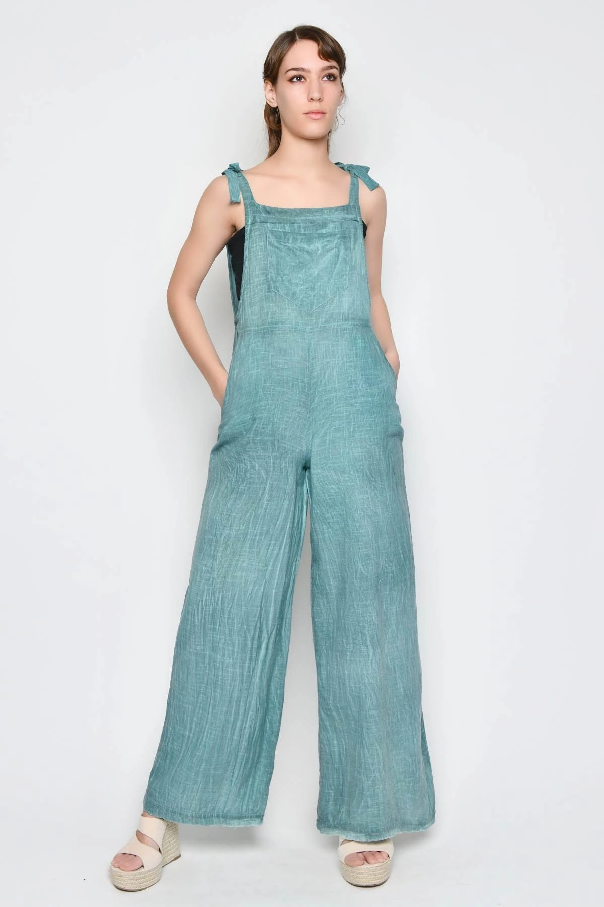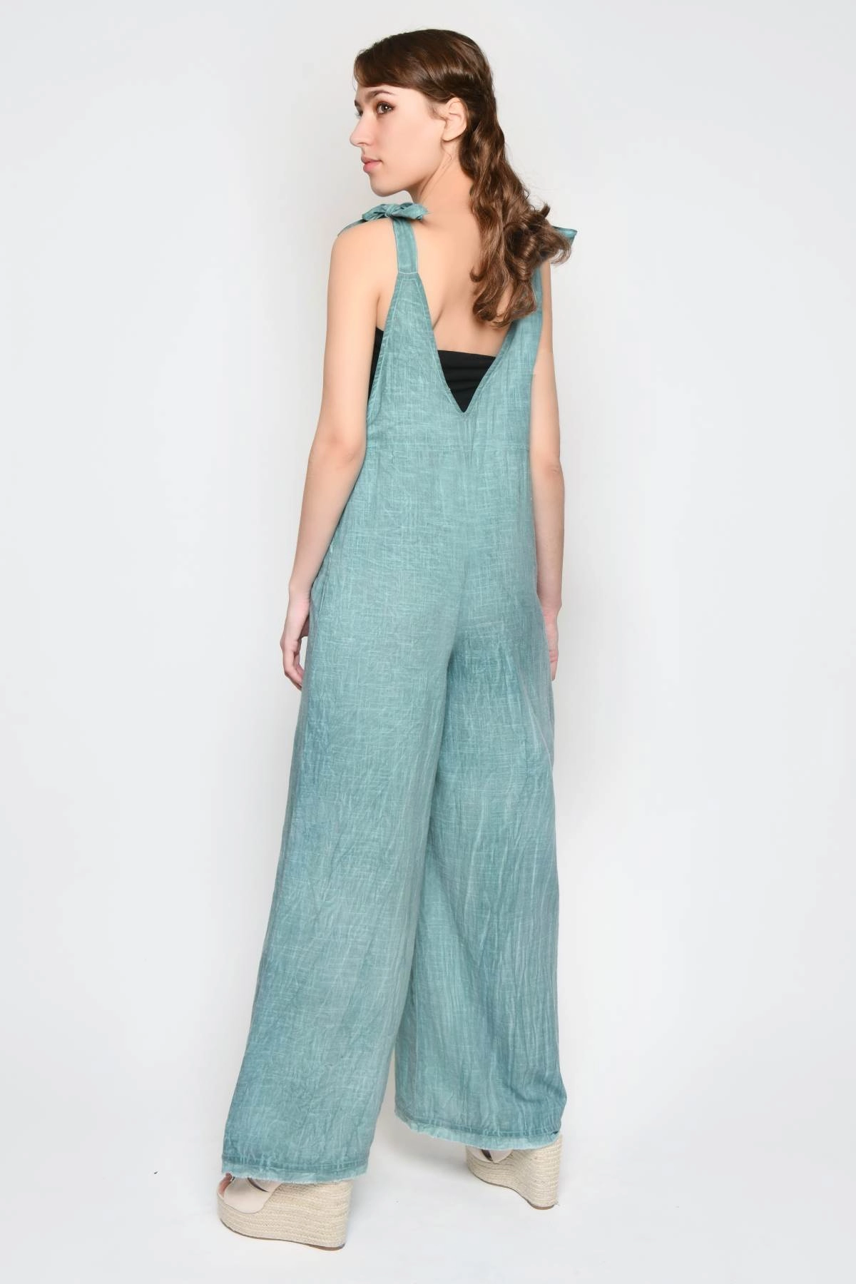 Tuta salopette lunga dallo stile casual, realizzata in cotone con trattamento effetto acid wash che dona al tessuto un aspetto leggermente vissuto e naturale. Il colore verde chiaro ha sfumature irregolari che rendono ogni capo leggermente diverso.