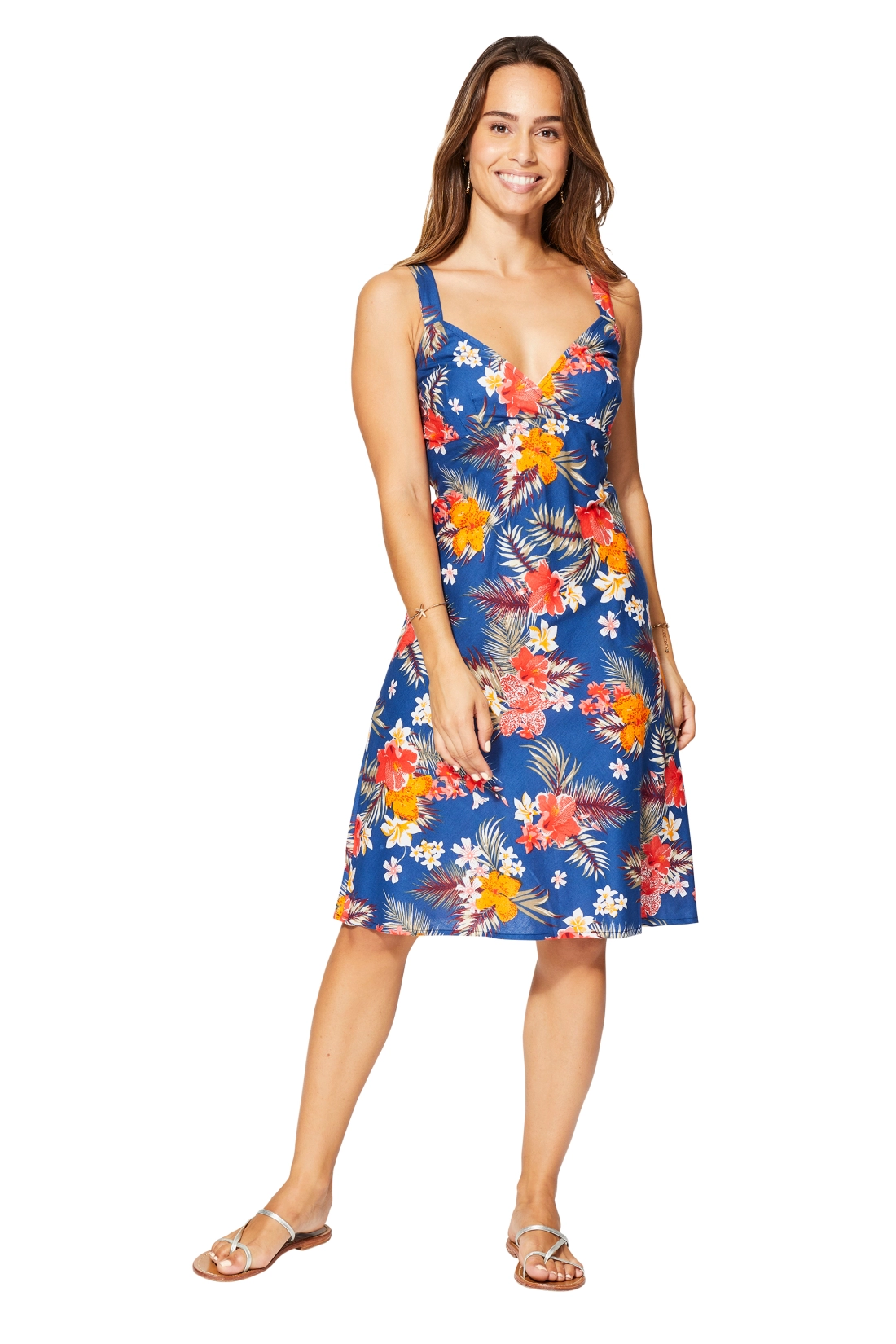 Abito in 100% cotone con fondo blu e fantasia floreale. Il modello ha spalline larghe, scollo a V incrociato e schiena elasticizzata per una vestibilità comoda. Un capo fresco e leggero, ideale per l’estate.