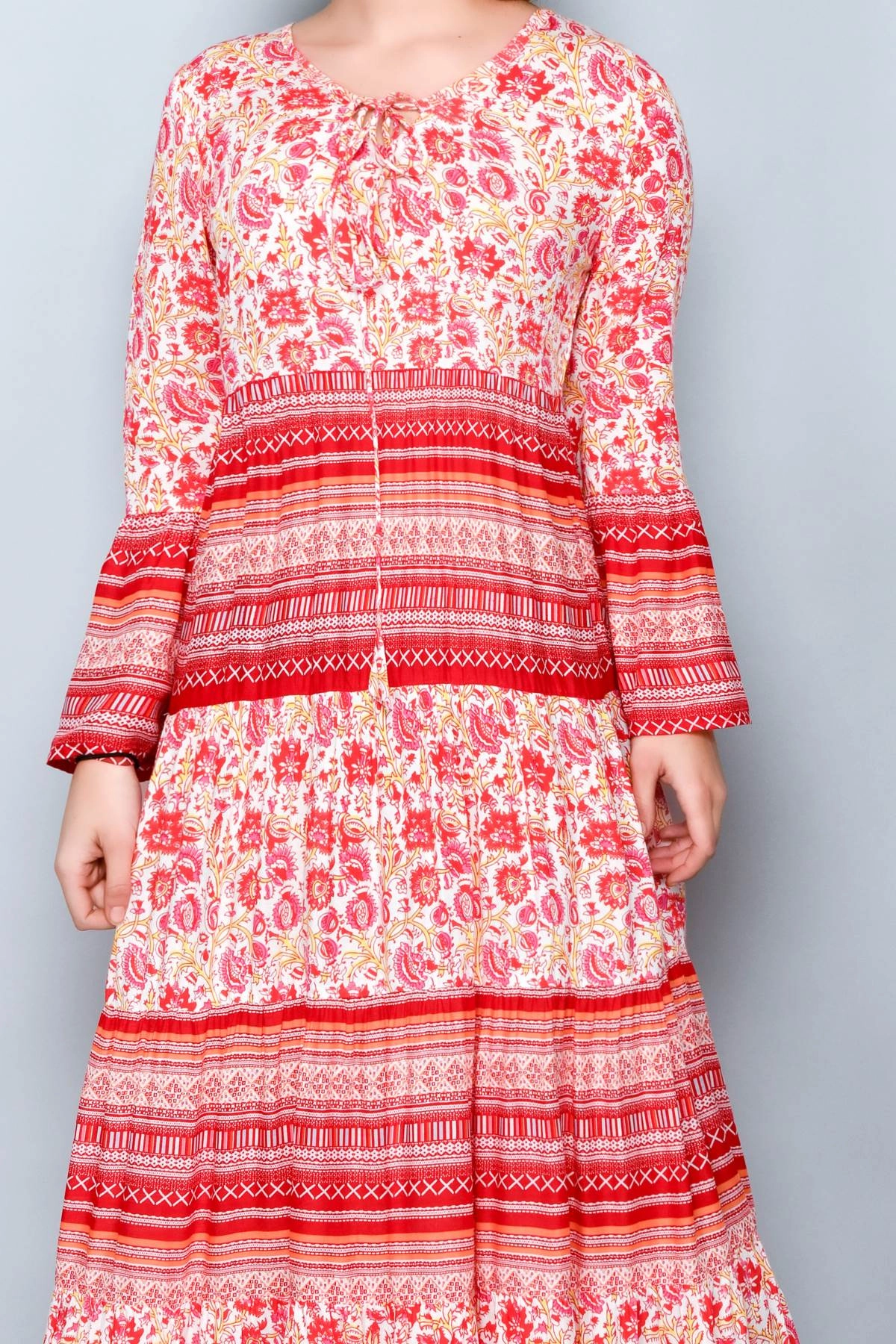 La stampa richiama lo stile Ibiza e la moda bohemien, con un effetto visivo vivace ma facile da portare. Il modello scende morbido sul corpo, non stringe e non segna, perfetto anche con il caldo. Le maniche con balza e il fondo ampio danno movimento all’abito, rendendolo piacevole sia per il giorno che per la sera.